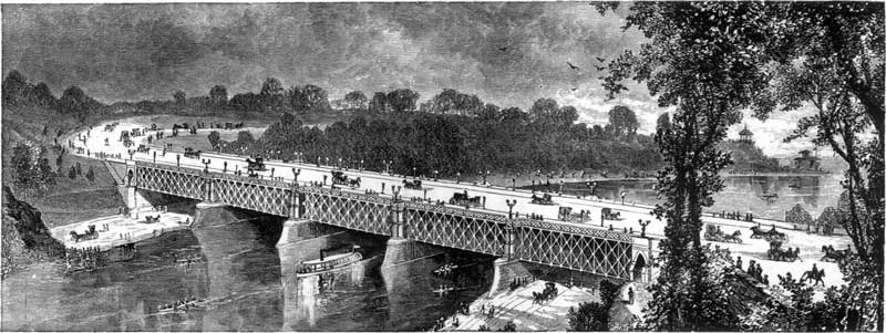 It would be an unpardonable neglect of the maxim which enjoins gratitude to the bridge that carries us safely over were we to complete our tour of the exposition structures without a glance at the graceful erections, diverse in magnitude and design, which overleap the depressions so attractive to the student of the picturesque and so trying to the pedestrian. The æsthetic capabilities of bridge architecture are very great, and a fine field is here offered for their display. The flat expanses of Hyde Park, the Champs de Mars and the Prater could afford no such exhibition. The ground and the buildings became, perforce, two sharply distinct things; and the blending into unity of landscape and architecture could be but imperfectly attained. Here the case is very different. With the aid of an art that embraces in its province alike the fairy trellis and the monumental arch and pilaster, the lines of Memorial Hall and other permanent edifices may be led over the three hundred acres appropriated to the exposition. From the foundation of a bridge-pier to the crowning statue of America, the artist finds an uninterrupted range.