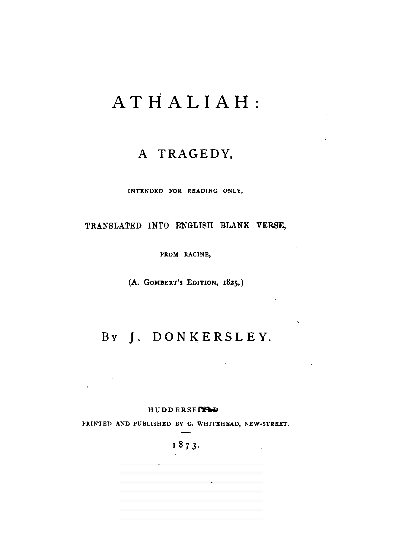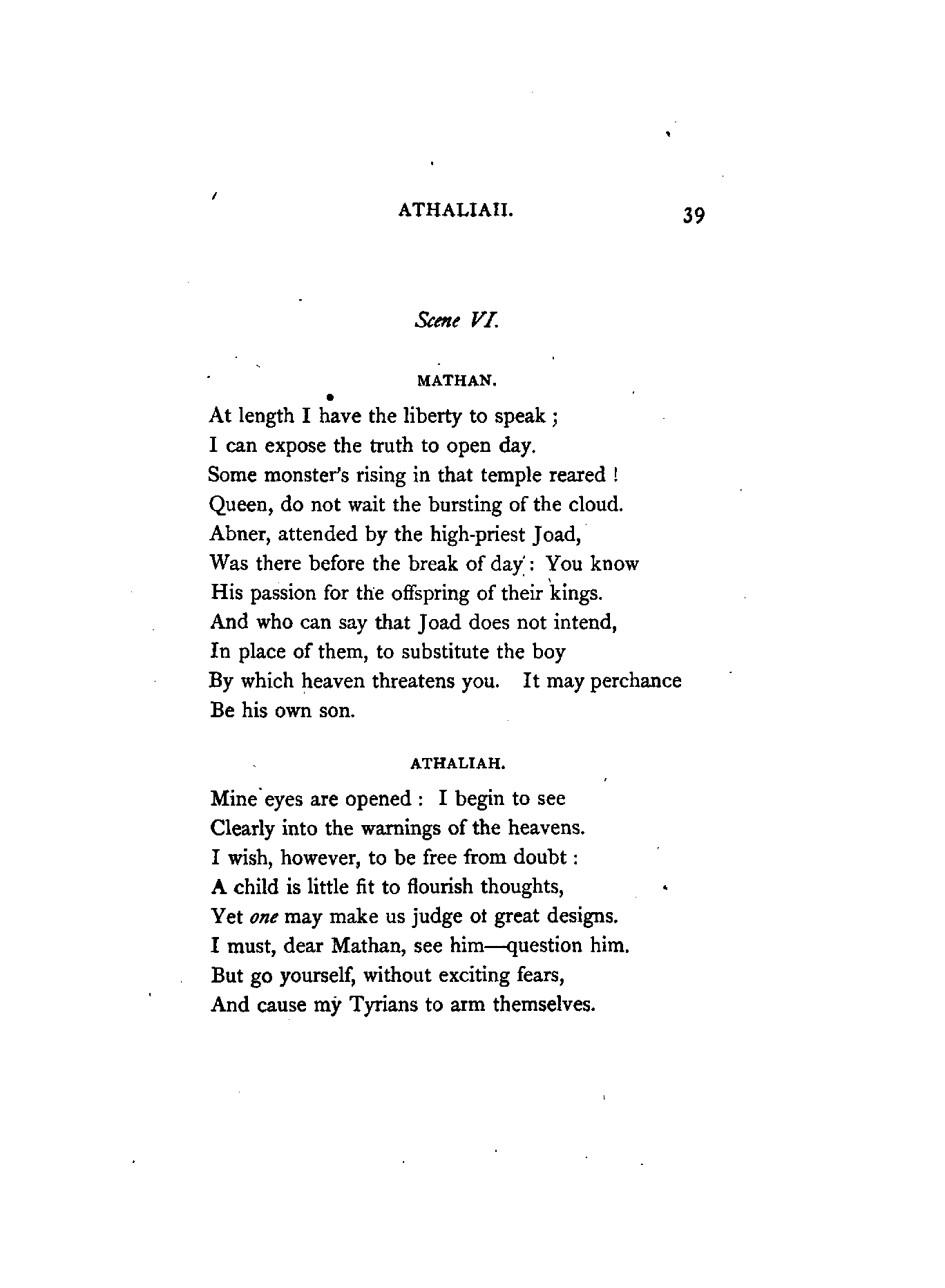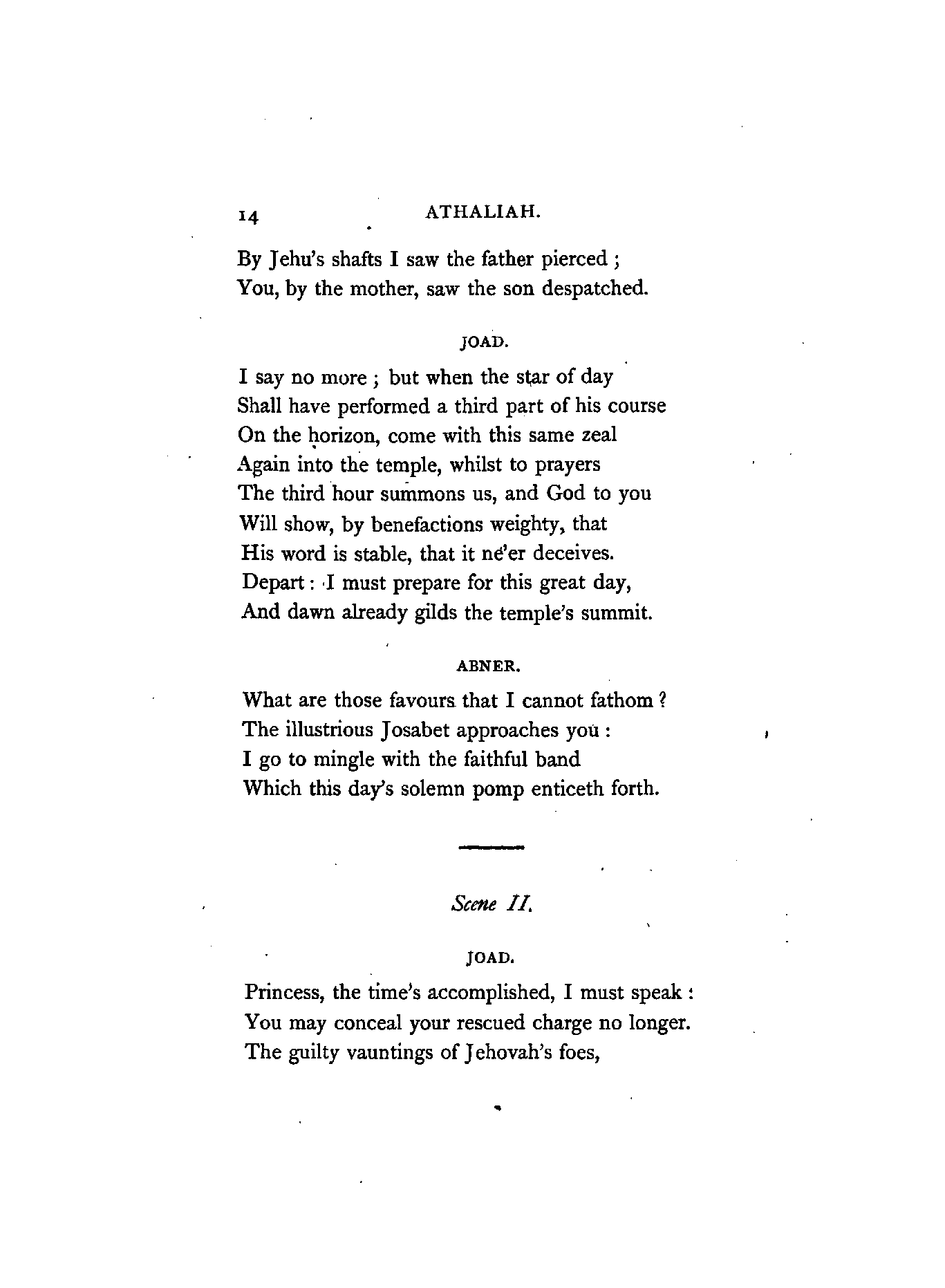 Racine, the author of Athalie (Athaliah), flourished in the latter half of the 17th century. At his appearance, Corneille, the great French Dramatist, was in the full splendour of his fame, whose rival he was afterwards recognised to be. Athalie is a Tragedy in rhyme, consisting of six Iambic feet, similar to the Alexandrine verse found occasionally in our English poets at the termination of a sentence or paragraph. Dryden, and a few others of less note, in the reign of Charles IL, introduced the rhyming drama to the English public; but the clank of its fetters was unpleasant to the British ear, which had become attuned to the freedom and majesty of blank verse. Blank verse, therefore, being our recognised vehicle of dramatic productions, has been employed in this translation. I did, however, intend in the first place to render the chorus into rhyme; but after maturer consideration it appeared to me that irregular blank verse would be more capable of tragic expression; and that it would also be more in harmony with the [4]Hebrew rhythm as represented by the scriptures, from which the plot was appropriated.