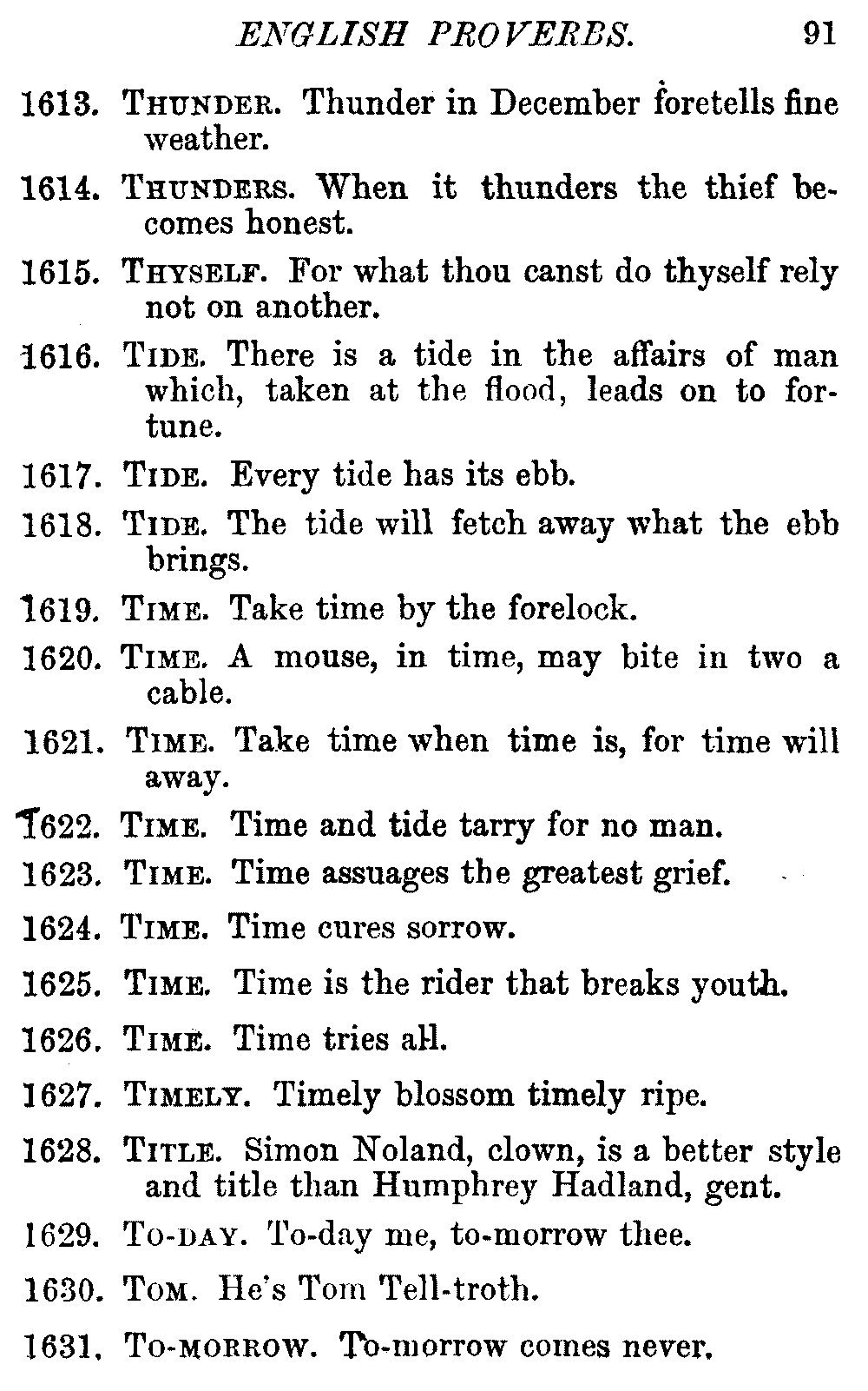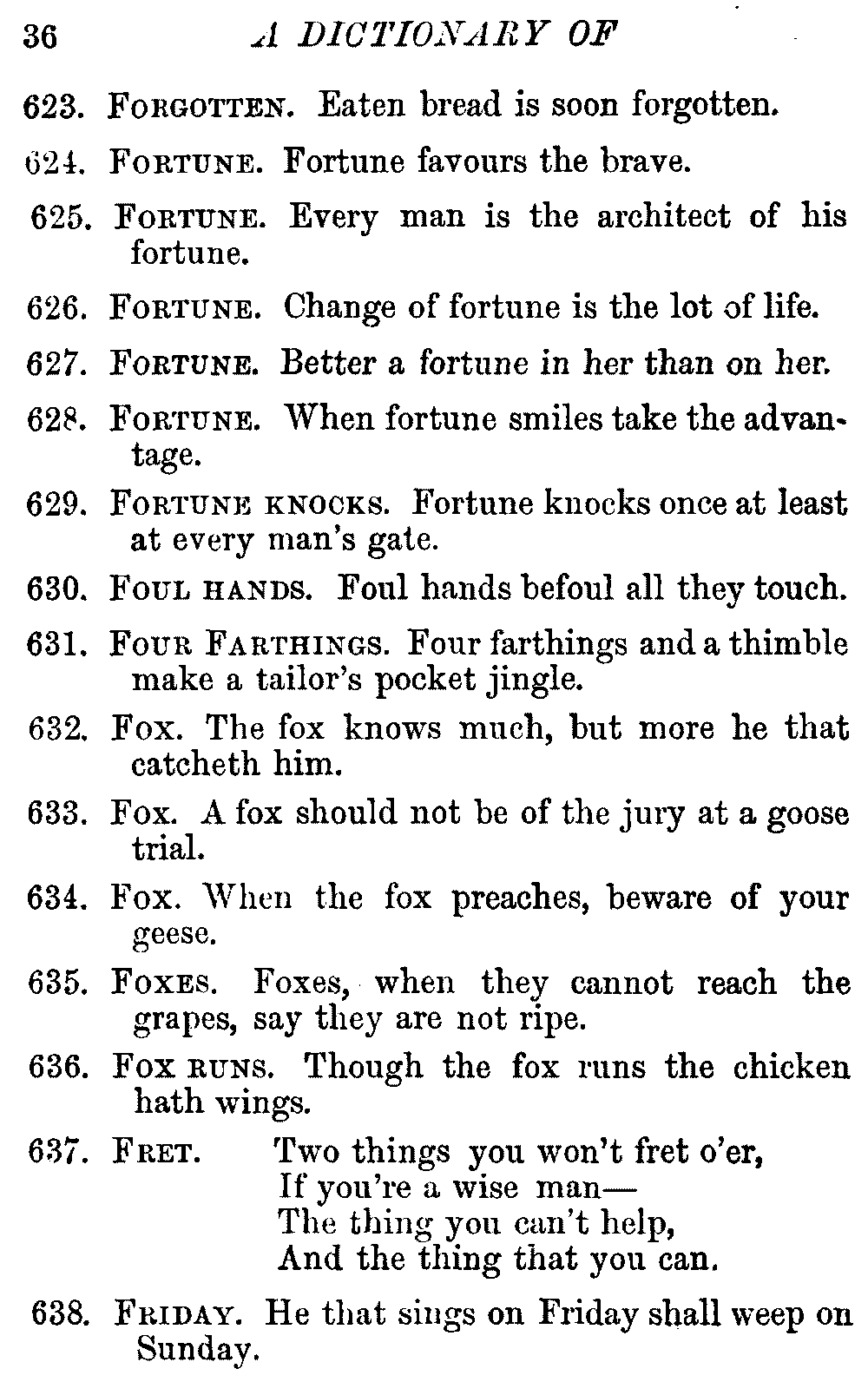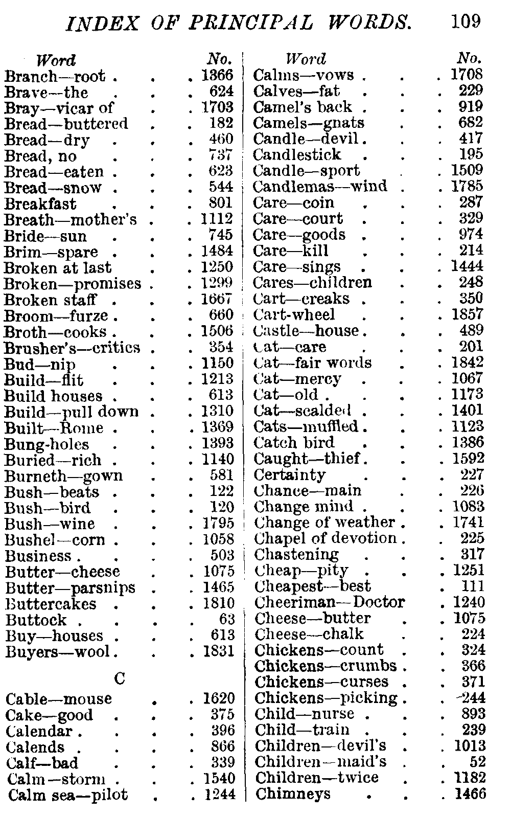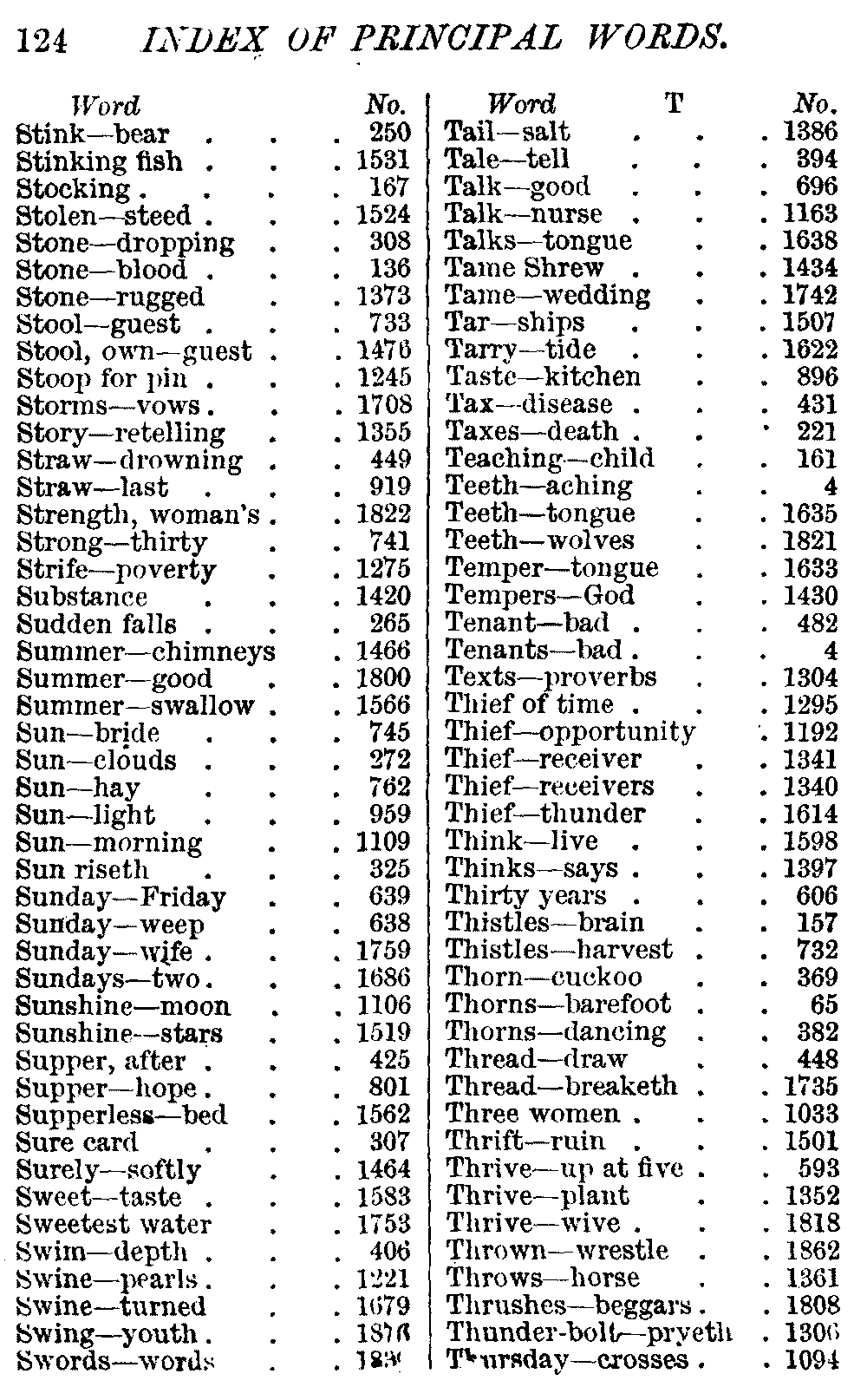 Other modern collections profess to give an "Alphabetical Index," but such an index is of little use when we find that it is framed on the rule that because a proverb begins with the article A, it should therefore be indexed under that letter. As, "A bald head is soon shaven." In another similar Index we find the proverb, "'Tis the second blow makes the fray," inserted under the letter T. In one index of this kind there are no less than twenty-two pages of A's [vii]and almost as many of The's. Indeed the whole index is compiled without the slightest regard to the subject of the proverbs. On this subject Disraeli, in his essay on the "Philosophy of Proverbs," says "The arrangement of proverbs has baffled the ingenuity of every one of their collectors. Ray, after long premeditation, has chosen a system with the appearance of an alphabetical order, but it turns out that his system is no system, and his alphabet is no alphabet. After ten years' labour the good man could only arrange his proverbs by commonplaces." In this little Dictionary, as we have already stated, the proverbs are arranged in alphabetical order, according to the leading words, and are consecutively numbered. But, in order to avoid repetition (as most of the proverbs contain, at least, two leading words), the subject words are used for the Dictionary, and the other principal words will be found in the Index, with a numerical reference to the proverb. The great advantage of this arrangement is, that if only one important word of a proverb be remembered, that word can be turned to in the Dictionary, and, if not found there, will certainly be in the Index. Nearly two thousand of the leading words are thus indexed—enough to make it almost impossible to miss finding what is wanted. This plan has also the effect [viii]of bringing together the proverbs on kindred subjects, which is often a matter of importance to writers, and is, moreover, most amusing to those who only read the book to while away a leisure hour. Ready reference is further facilitated in the Index by the addition of associated words. If one word only had been given, the reader might have had to refer to eleven proverbs before he found the one he required; as, for example, in the case of Dog.