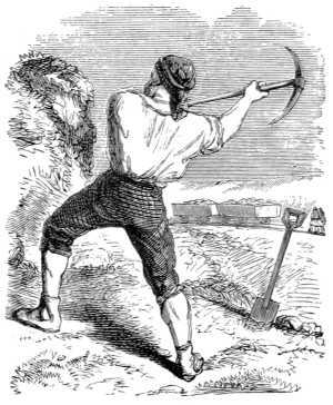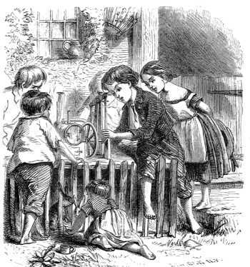 What useful little fellow is this, carrying his father's dinner to him at the coal-pit? He takes care, also, of his little brothers and sisters, keeping10 them clear of the coal-waggons, which run to and fro before the cottage door. Then he is seen tending a neighbour's cows. Now he is moulding mud engines, sticking in hemlock sticks for blowpipes; besides cutting many a good caper, and uttering all sorts of drolleries for the benefit of other little boys, who, like himself, swarm round, too poor to go to school, if school there were—but schools there were none.