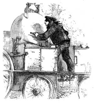 A brakeman has charge of an engine for raising20 coal from a pit. The speed of the ascending coal, brought up in large hazel-wood baskets, was regulated by a powerful wooden brake, acting on the rim of the fly-wheel, which must be stopped just when the baskets reach the settle-board where they are to be emptied. Brakemen were generally chosen from experienced engine-men of steady habits; and in spite of the grumbling of older colliers, envious perhaps of his rise, it was not long before George learned, and was appointed brakeman at the "Dolly pit." This was in 1801.