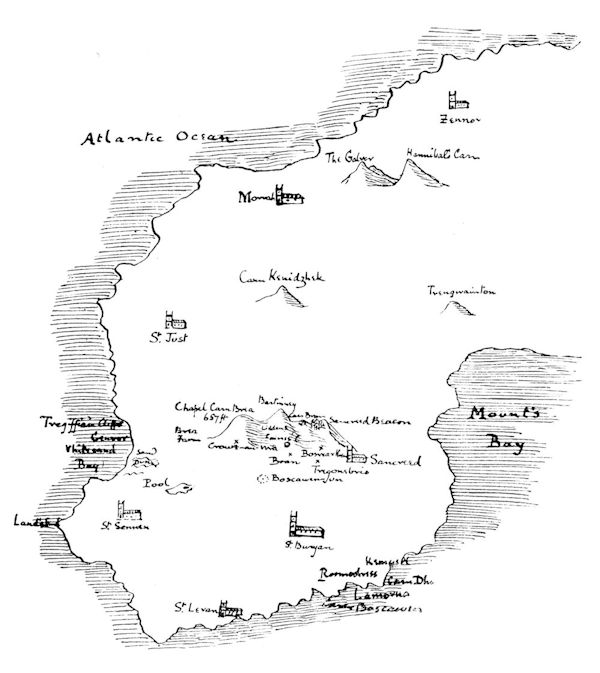 The Cornish Heights terminate near the Land’s End in four wild hills of singular charm, though of very modest altitude. Springing as they do from a treeless tableland, they look quite like a miniature mountain range, especially when seen through rolling mists or capped by the rain-laden clouds which, like birds coming weary from the Atlantic, settle on their summits. Man seldom intrudes there, though they offer a peerless prospect over promontory and ocean. The faint paths amongst ling and furze are not his: they have been traced by the foxes that kennel on this silent retreat, or by badgers going to and from the deep sett on the northern slope; for the desolate upland has long been given over to the outlawed creature, and furnished sanctuary to any wildling that sought it.