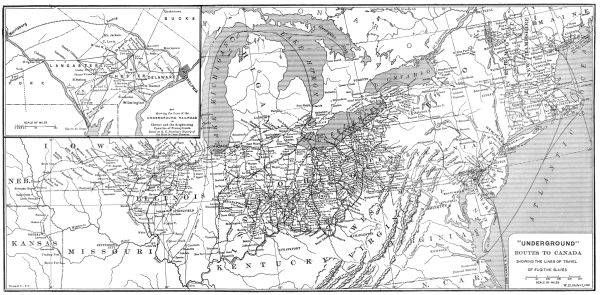 Professor Siebert has applied to the whole subject a graphic form of illustration which is at the same time a test of his conclusions. How can the scattered reminiscences and records of escapes in widely separated states be shown to refer to the results of one organized method? Plainly by applying them to the actual face of the country, so as to see[xi] whether the alleged centres of activity have a geographical connection. The painstaking map of the lines of the Underground Railroad "system" is an historical contribution of a novel kind; and it is impossible to gainsay its evidence, which is expounded in detail in one of the chapters of the book. The result is a gratifying proof of the usefulness of scientific methods in historical investigation; one who lived in an anti-slavery community before the Civil War is fascinated by tracing the hitherto unknown stretches north and south from the centre which he knew. The map bears testimony not only to the wide-spread practice of aiding fugitives, but to the devotion of the conductors on the Underground Railroad. How useful a section of Mr. Siebert's map would have been to the slave-catcher in the 50's, when so many strange negroes were appearing and disappearing in the free states! The facts presented in the brief compass of the map would have been of immense value also to the leaders of the Southern Confederacy in 1861, as a confirmation of their argument that the North would not perform its constitutional duty of returning the fugitives; yet there is no record in this book of the betraying of the secrets of the U. G. R. R. by any person in the service. The moral bond of opposition to the whole slave power kept men at work forwarding fugitives by a road of which they themselves knew but a small portion. The political philosophers who think that the Civil War might have been averted by timely concessions would do well to study this picture of the wide distribution of persons who saw no peace in slavery.
