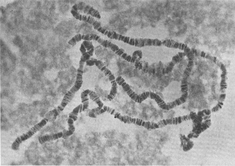 Stained section of one cell from salivary gland of Drosophila, or fruit flies, reveals dark bands that may be genes controlling specific traits.