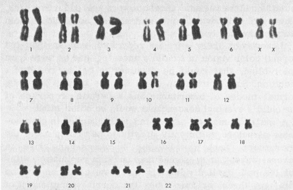 In 1959, such a situation was found to exist in the case of persons suffering from a long-known disease called Down’s syndrome.[2] Each person so afflicted has 47 chromosomes in place of the normal 46. It turned out that the 21st pair of chromosomes (using a convention whereby the chromosome pairs are numbered in order of decreasing size) consists of three individuals rather than two. The existence of this chromosome abnormality clearly demonstrated what had previously been strongly suspected—that Down’s syndrome originates as a mutation and is inborn (see the figure on the next page).