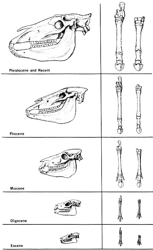 Evolution of the horse (skull, hindfoot, and forefoot shown). Note the changes over a 60-million-year period from the Eocene era to the present.