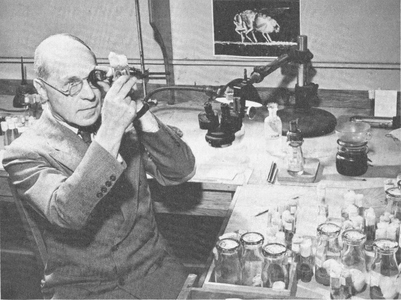 Geneticist Hermann J. Muller studying Drosophila in his laboratory. Dr. Muller won a Nobel Prize in 1946 for showing that radiation can cause mutations. (See page 34.)