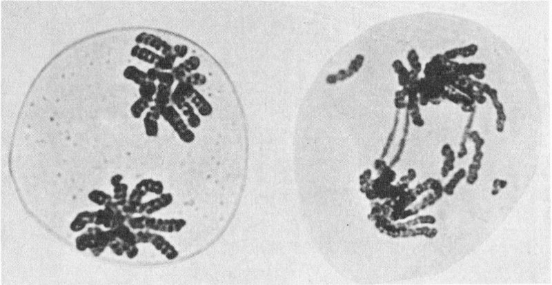 To study chromosomes, scientists begin with a cell that is in the process of dividing, when chromosomes are in their most visible form. Then they treat the cell with a chemical, a derivative of colchicine, to arrest the cell division at the metaphase stage (see mitosis diagram on preceding page). This brings a result like the photomicrograph above; the chromosomes are visible but still too tangled to be counted or measured. Then the cell is treated with a low-concentration salt solution, which swells the chromosomes and disperses them so they become distinct structures, as below.