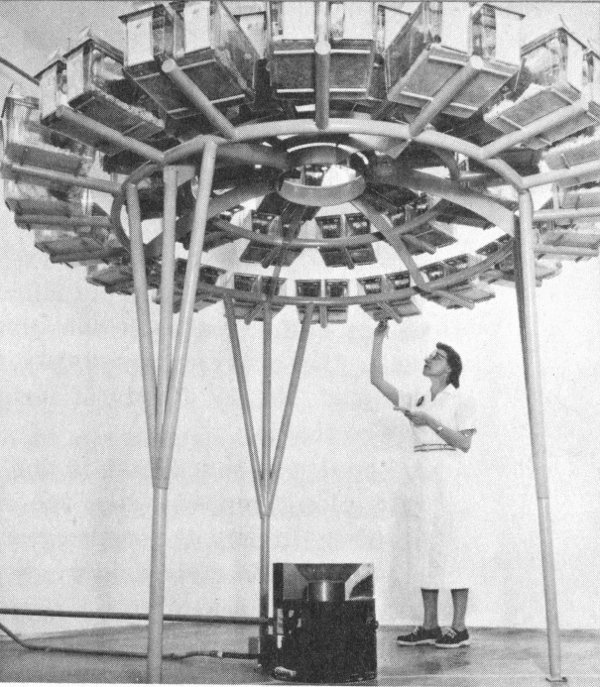 Arrangement for long-term low-dose-rate irradiation of mice used for mutation-rate studies at Oak Ridge National Laboratory. The cages are arranged at equal distances from a cesium-137 gamma-ray source in the lead pot on the floor. The horizontal rod rotates the source.