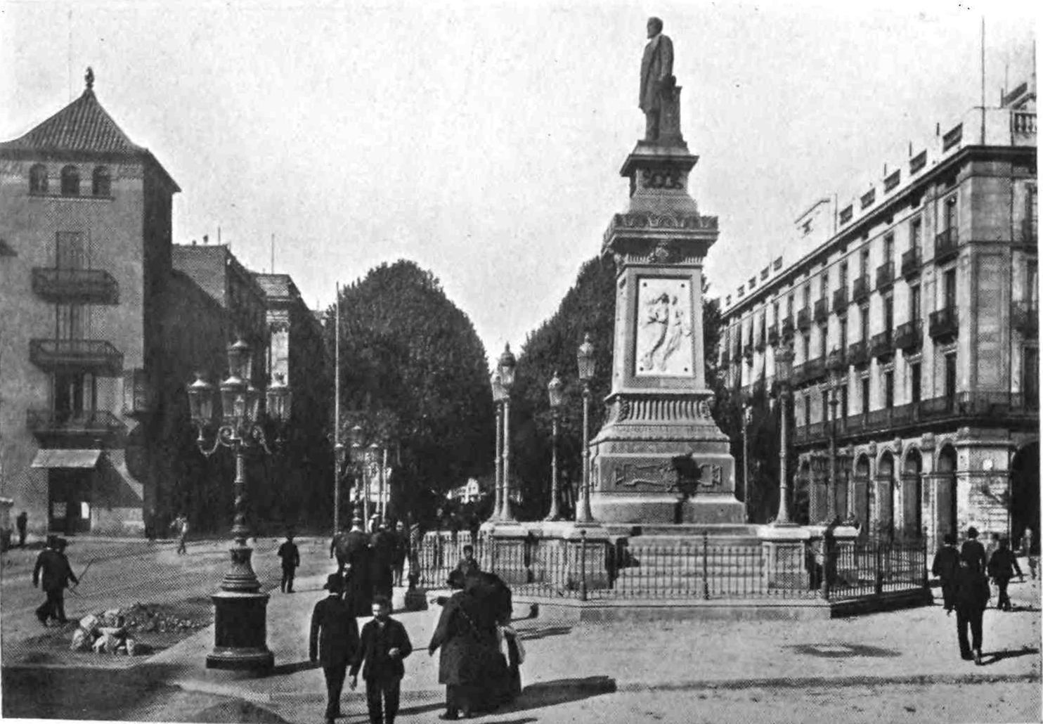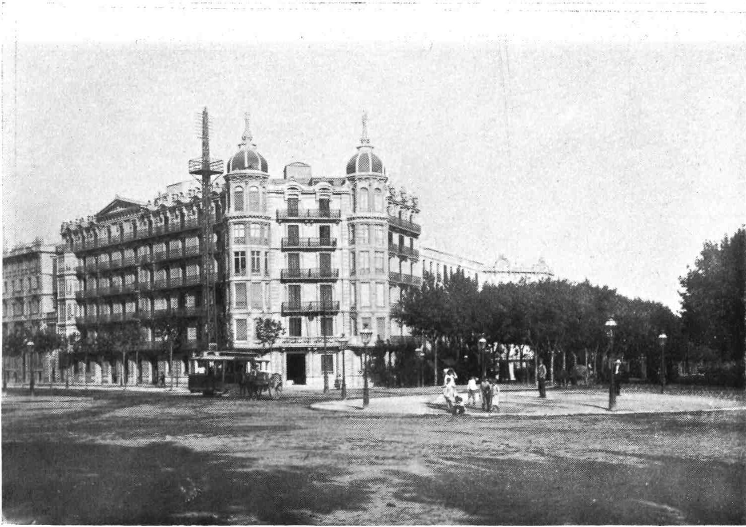 Barcelona has remained true to her traditions. She is still, as of old, a city of merchant princes, a hive of industry, at once the Liverpool and Manchester of Spain. To those who visit the capital of Catalonia after an acquaintance only with the moribund cities of Old Castile, this vision of España Moderna comes as a shock and a revelation. The first impression is not pleasing. You approach the city through a vast wilderness of suburbs, teeming with life, and breathing apparently through grimy factory chimneys. We realise that we have returned to the civilised twentieth century. But the brighter side of modernity is soon revealed. In its heart Barcelona is clean, bright, and spacious. The boulevards are unequalled in Europe—except perhaps by Budapest—and the street prospects are worthy of Washington. The Rambla is the most delightful of promenades; in the Calle Fernando the contents of every shop window tempt the unthrifty. A noble, beautiful modern metropolis, still worthy of Cervantes’ encomium: “Flor de las bellas ciudades del mundo, honra{9} de España, reglo y delicia de sus moradores, y satisfacción de todo aquello que de una grande famosa, rica, y bien fundada ciudad, puede pedir un discreto y curioso deseo.”