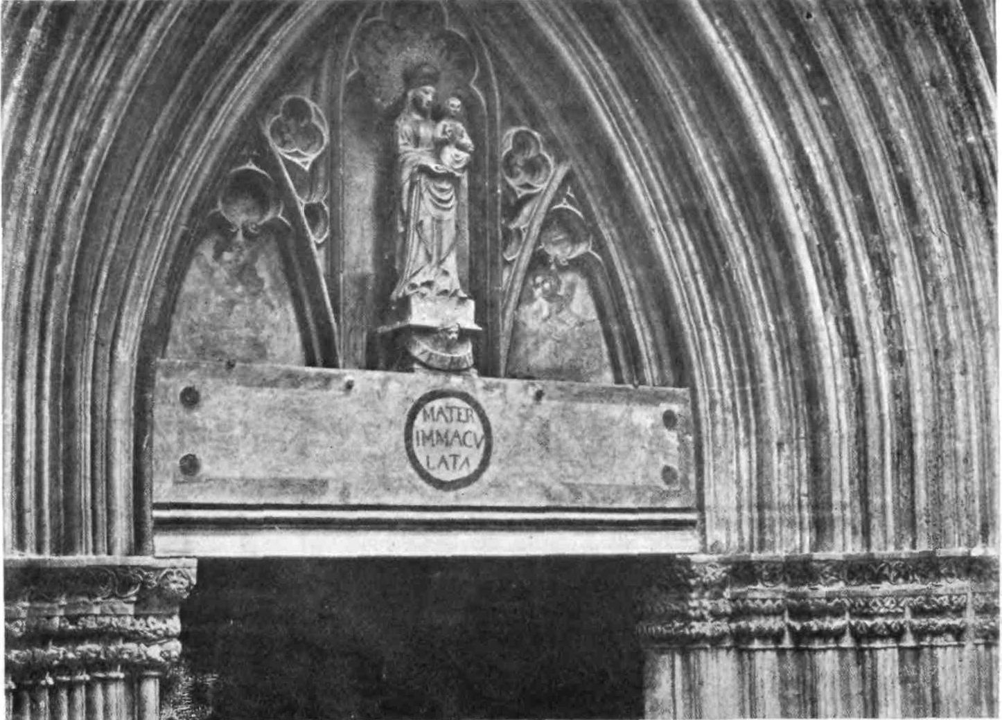 The principal portal, called in the Catalan dialect the Puerta dels Fillols, opens into the middle of the south aisle. “This [says our authority] is an example of singularly rich transitional work, with an archivolt enriched with chevrons, mouldings, dog-tooth, intersecting arches, and elaborate foliage. There is the usual horizontal cornice over the arch, and above this is a fourteenth-century statue of the Blessed Virgin Mary and Our Lord. The horizontal cornice is carried on moulded corbels, between which and the wall are carvings of wyverns and other animals; whilst the soffit of the cornice in each compartment is carved with delicate tracery panels, in some of which I thought I detected some trace of Moorish influence. The cornice has a delicate trailing branch of foliage; and the labels and two or three orders of the arch, in which sculpture of foliage is introduced, are remarkable for the singular delicacy and refinement of the{44} lines of the foliage, and for the exceeding skill with which they have been wrought. There is none of that reckless dash which marks our carvers nowadays, but in its place a patient elaboration of lovely forms, which cannot too much be praised. The mouldings here are all decidedly characteristic by a later—probably fifteenth-century—vaulted porch, which occupies the space between two added chapels. The effect is very good and picturesque.”