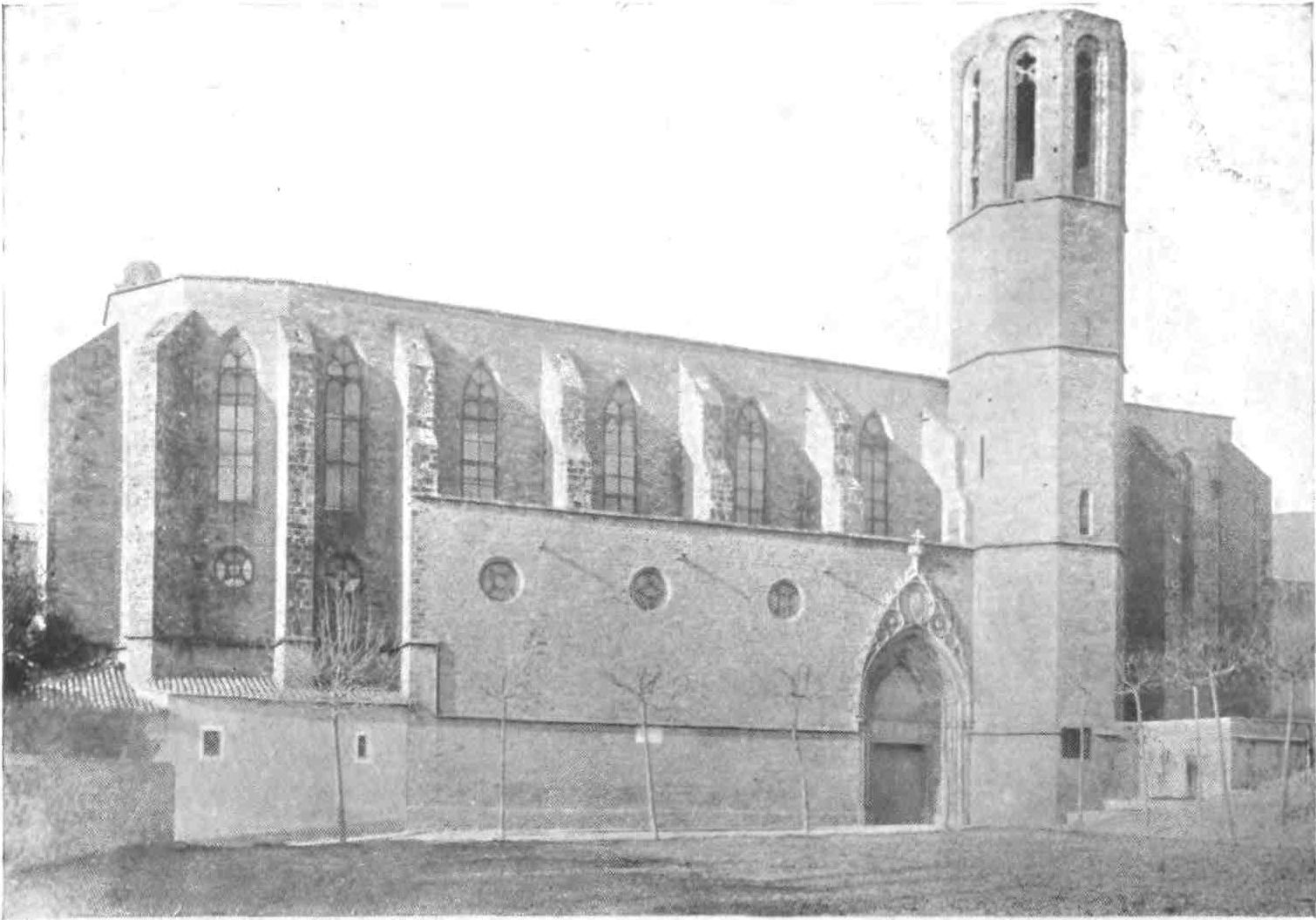 We presently pass the Bishop’s Palace, an eighteenth-century structure incorporating some late Romanesque arcading. But leaving other interesting buildings in this the oldest quarter of Barcelona for the moment, we will seek the next most notable church in the town, that of Santa Maria del Mar. It occupies the site of the earliest shrine of Santa Eulalia, over which Bishop Aetius built a temple in the thousandth year of our era. This modest church was replaced by another in the year 1329, which was restored and reconsecrated after a disastrous fire in 1383 under the reign of Pedro the Ceremonious. All classes of the community assisted in the work. Those who could not give money gave their labour, and in commemoration of this two small bronze figures carrying stone and timber adorn the principal door. The edifice is a good example of the Catalan church in its breadth and height of nave and simplicity of plan. Like the cathedral, it forms a parallelogram rounded at the east end, and presents an unbroken line of{16} wall to the exterior. Churches of this type usually consist of nave only, but Santa Maria del Mar has two aisles. Enormous octagonal columns carry the main arches and the groining ribs which all spring from their capitals. The wall rib towards the nave is carried up higher than the main arches, so as to allow space between them for a small circular and traceried clerestory window in each bay. The arches of the apse are very narrow, and enormously stilted. There are small windows above them, but they are modernised. The aisles are groined on the same level as the main arches, a few feet, therefore, below the vault of the nave, and they are lighted by a four-light traceried window in each bay, the sill of which is above the string-course formed by continuing the abacus of the capitals of the groining shafts. Below this are three arches in each bay, opening into side chapels between the main buttresses. Each of these chapels is lighted by a traceried window of two lights, and the outer wall presents a long unbroken line, until above the chapels, when the buttresses rise boldly up to support the great vaults of the nave and aisles.[A] The interior, though still simple and dignified, has been marred by modern restorations. Another peculiarity remains to be noted: the choir is placed{17} behind the high altar. Of this latter, a costly but churrigueresque erection, the less said the better. The royal pew in the south aisle, recalling the days when Barcelona was a capital, was connected with the palace by a gallery now destroyed. The church contains some good glass and examples of the art of Villadomat, a painter of whom Catalonia can boast. His fate was extremely sad: for the last seventeen years of his long life, he was paralysed in both hands.
