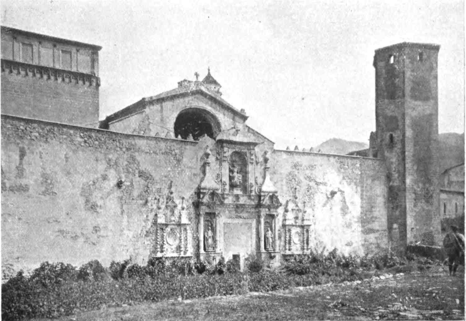 Returning from Lerida to Barcelona we pass the castle of Bellpuig, the seat of the great family of Anglesola—a massive fortress of red stone, restored in the sixteenth century. Its magnificent staircase still gives one some idea of the pomp and state of its former lords. The village extends from the castle to the church—a situation which inspired the erudite topographer of this country (Piferrer) with reflections that remind one of Don Quixote’s address to the goatherds. The church contains the tomb of Don Ramon de Cordova, one of the ablest lieutenants of Gonzalo de Cordova. His effigy, armed and holding his helmet, reclines in a sleeping posture on an urn adorned with reliefs of marine gods and monsters and upheld on the backs of sirens, whose hands are webbed; the sepulchral arch is formed by six Ionic columns, against which lean figures expressive of mourning; over the tomb is a relief of the Entombment. In niches on each side of{50} the arch are two life-size figures emblematic of Victory; above them, two figures leaning forth from medallions appear to extend laurels toward the hero. The plinth and cornice of this superb tomb are adorned with reliefs illustrating the victories and achievements of the deceased, who was as distinguished as an admiral as a general. His body remains in the urn practically incorrupt. The tomb is the work of Juan Nolano.