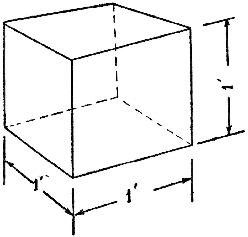 You will recall a preceding statement that evaporated humidity turns into water when it becomes cool below a certain point. (See page 14, Effect of the Sun.) A given amount of air will hold a certain amount of moisture. For example, let us assume that a cubic foot of air (see Fig. 11) is saturated, that is, it is holding all the water it will retain. Now if this cubic foot of air is cooled, it will contract, and as a result there will not be enough room to hold both the air and moisture, so the excess moisture will leak out. (See Fig. 12.) The result of this reduction in temperature causes precipitation, simply because the air cannot sustain the water that is in it. Therefor, at any time when moisture in the air has reached the point of saturation and a chilling takes place, due to the air becoming cold, rain follows. This may happen as a result 21of air rising into higher places or cooler levels, or through its contact with cooler surfaces.