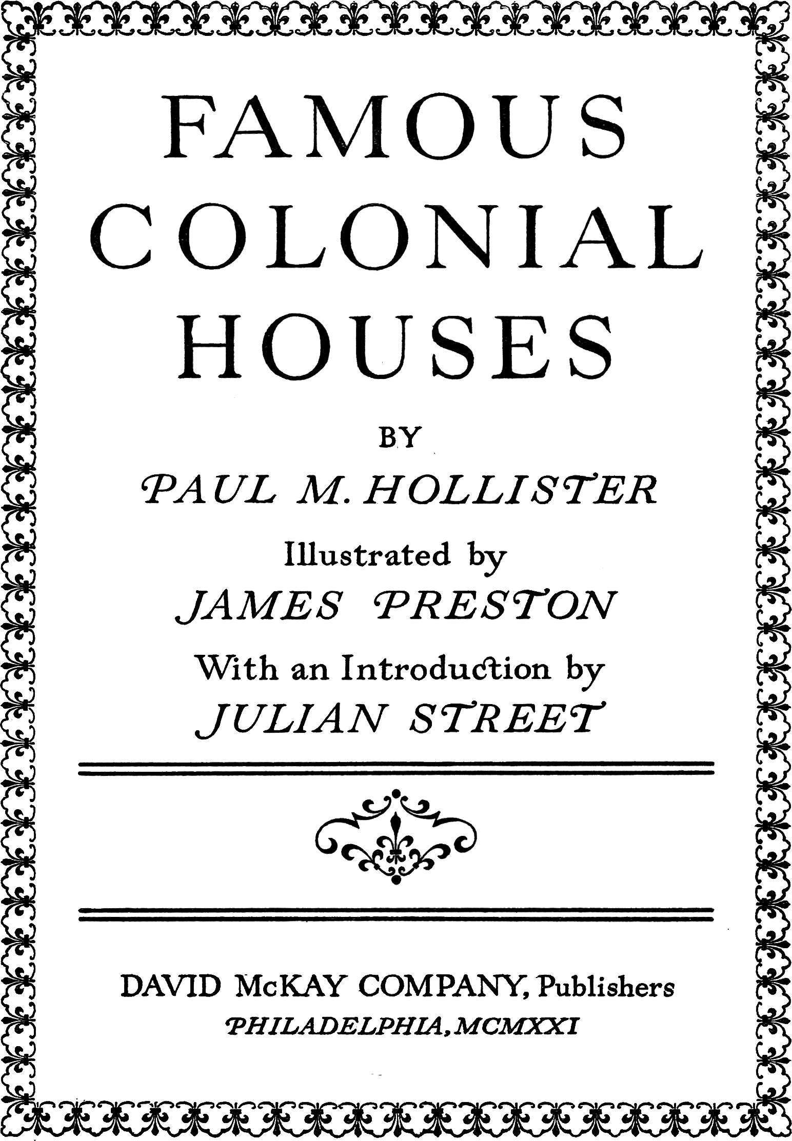 There is no bibliography in this book. I confess freely to a snapping-up of ill-considered trifles where I found them. Those that rang true are here, those that proved false upon closer examination are not. Some were gifts, some purchases, some thefts—the latter are now shamelessly confessed, on the plea that as a citizen I have the right of eminent domain to the story of my country. I cannot put the volume out to shift for itself without blanket acknowledgment of the generosity of the people who put me in the way of finding reliable information. Several of them are the owners of the houses; some of them have even read this manuscript.