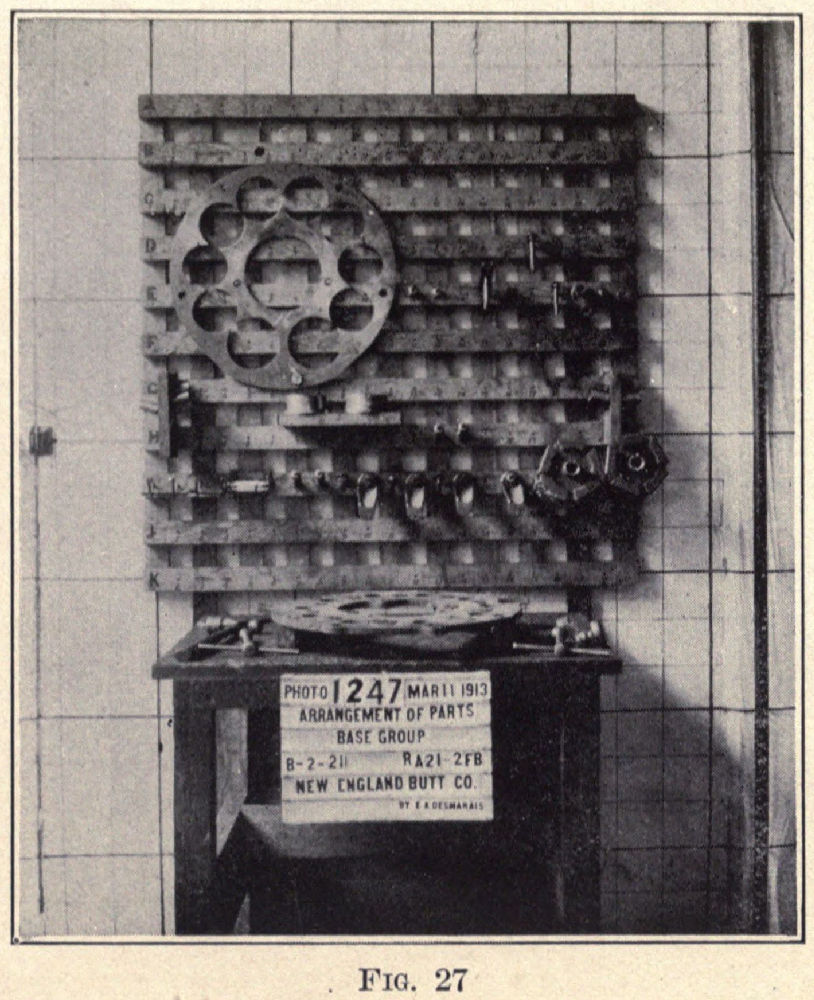 It became apparent, as the work progressed, that the determining elements were (1) to shorten, as far as possible, the distance for transporting the arms and hands while loaded; (2) to arrange the parts so that their sequence of use would be obvious; (3) to position each piece so that it could be grasped, transported, and released in the shortest time with the least expenditure of effort and with the least resulting fatigue. This meant that the parts should be arranged on some sort of a holder, or packet, that would shorten the transporting distance, and that the base group should be placed upon a table that would carry it as near this packet as possible.