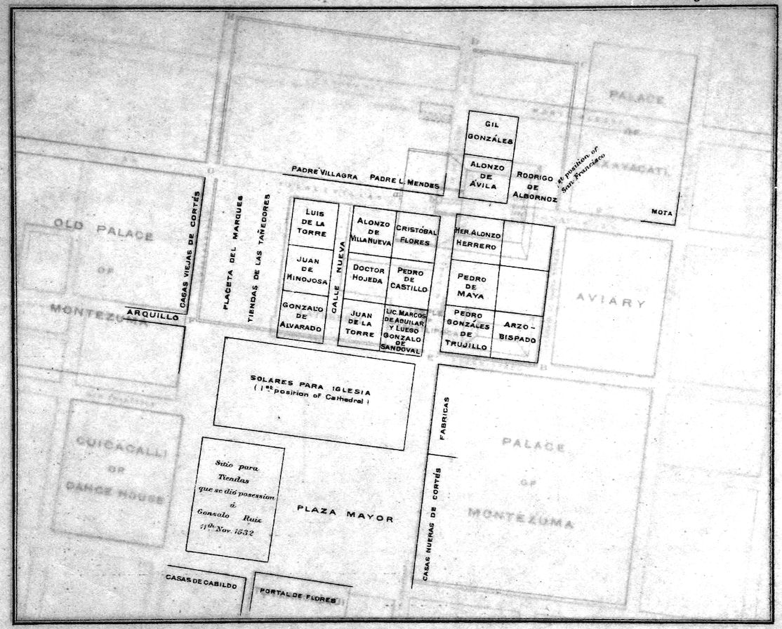 “The said Señores [here follow the names of those present] declare that inasmuch as in time past when the Factor and Veedor were called Governors of New Spain they allotted certain Solares within this City, which Solares are facing Huichilobos (son frontero del Huichilobos), which Solares (because the Lord Governor on his arrival together with the Municipality reclaimed them, and allotted them to no one for distribution) are vacant and are [suitable] for building and enclosure; and inasmuch as the aforesaid is prejudicial to the ennoblement of this city, and because their occupation would add to its dignity, they make a grant of the said space of Solares, allotting in the first place ten Solares for the church and churchyard, and for outbuildings in the following manner:—Firstly they say that they constitute as a plaza (in addition to the plaza in front of the new houses of the Lord Governor), the site and space which is unoccupied in front of the corridors of the other houses of the Governor where they are used to tilt with reeds, to remain the same size that it is at present.