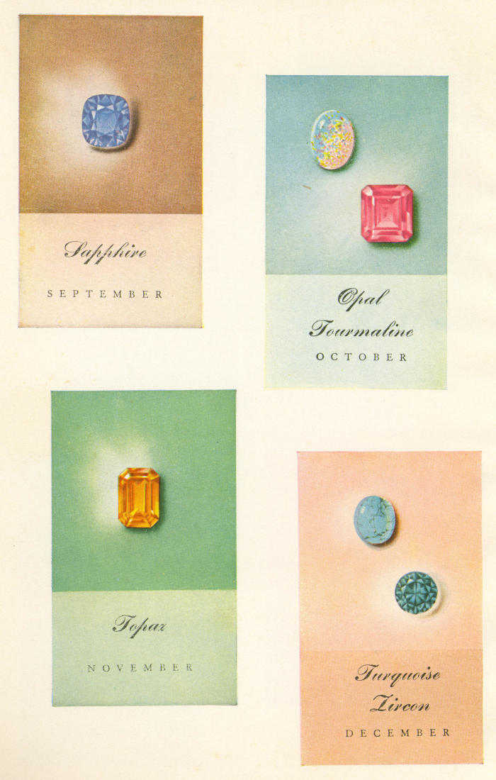 For those with the enthusiasm and the funds, almost an entire alphabet of gem stones can be used. Omitting duplicates, one may run along, to spell one’s message, with amber, bloodstone, carnelian, diamond, emerald, fluorite, garnet, hyacinth, indicolite, jasper, kunzite, lapis lazuli, moonstone, nephrite, opal, pearl, quartz, ruby, sapphire, turquoise, variscite, willemite, zircon. This fashion of conveying one’s sentiments has never grown obsolete and is continually renewed.