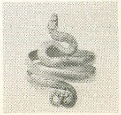 The snake itself, being associated with the sybils and other prophets of old and linked with man in earliest Bible story and man’s most fateful hour, is also a most potent and frequent device. It might be carved upon the ring, or the whole ring itself might represent a serpent, eating its own tail—like the worm Ouroboros that winds around the world and keeps it from bursting asunder—or with its head nestling upon its body, watching for the approach of danger. Being itself a lurking danger, the snake obviously was most fit to search out hidden evil. A snake ring of gold with ruby eyes was often on the finger of George IV of England.