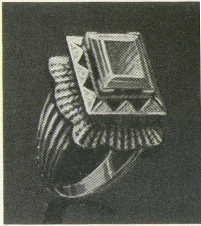 While the 250 odd rings of England’s last King Henry were probably seldom equalled for one person, a more modest but[303] more representative listing was given, in 1649, of the rings of a country lady. She possessed, among other jewels, a toadstone ring, two Turkies (turquoises), six thumb rings, three alderman’s seals, five gemmels and four death’s heads. Always, in every period and every guise, the realm of jewelry has been marked by the reign of the ring.