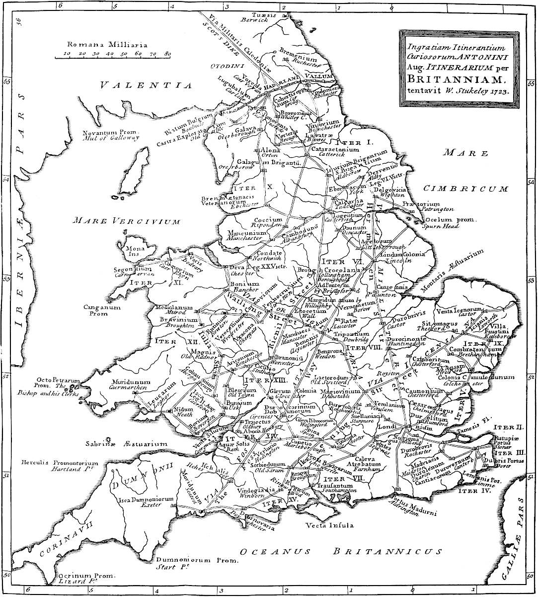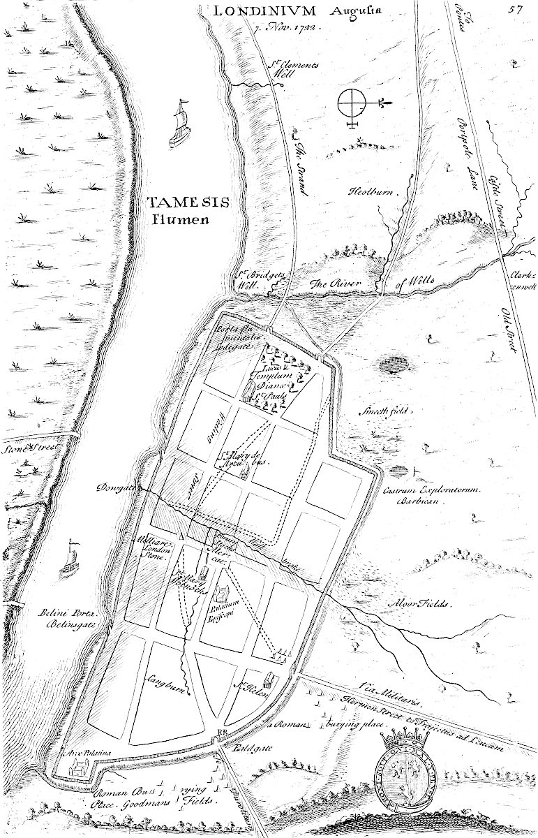 The road which we suppose the original stem of the Hermen Street goes in a direct line, and full north and south from Durobrivæ, or Caster, to Sleford; and there, for aught I know, it terminates. It is manifest, that if it had been carried further in that direction, it would have passed below Lincoln heath, and arrive at the river where it is not fordable. It parts from the present and real Hermen Street at Upton, a mile north of Caster; but this is continued in a strait line, which demonstrates that it is the original one: the other goes from it with an angular branching. This traverses the river Welland at Westdeeping, and is carried in a high bank across the watery meadows of Lolham bridges.[6] These are numerous and large arches made upon the road, to let the waters pass through, taken notice of by the great Camden as of antiquity; and no doubt originally Roman: then it crosses the Glen at Catebridge, (whereabouts it is now called King’sgate, via regia) to Bourn, (where Roman coins are often found, many in possession of Jos. Banks, jun. esq.) so to Fokingham and Sleaford. It is now called Longdike. All along parallel to this road runs a famous old drain, called The Cardike. Cardike.[7] Mr. Morton has been very curious in tracing it out through his county, Northamptonshire. I am sorry I have not yet had opportunity to pursue his laudable example, in finishing the course of it through Lincolnshire: but as far as I have observed it, it is marked in the map. This is a vast artificial canal drawn north and south upon the edge of the fens, from Peterburgh river to Lincoln river, about fifty mile long, and by the Romans without all peradventure. It is taken notice of by serjeant Callis, our countryman, in his readings on the sewers. That wise people, with a greatness of thought peculiar to themselves, observed the great use of such a channel, that by water carriage should open an inland traffic between their two great colonies of Durobrivæ and Lindum, or Lincoln, without going round the hazardous voyage of the Estuary: just such was the policy of Corbulo in Tacitus, Annal. xi. Ne tamen miles otium indueret inter Mosam Rhenumque trium & viginti millium spatio fossam produxit, qua incerta oceani evitarentur. And lest the soldiery should be idle, he drew a dike for the space of three and twenty miles between the Maese and the Rhine, whereby the dangers of the ocean are avoided; which is exactly a parallel case with ours. Besides, it is plain that by intercepting all the little streams coming down from the high country, and naturally overflowing our levels, it would much facilitate the draining thereof, which at this time they must have had in view. This canal enters Lincolnshire at Eastdeeping, proceeding upon an exact level, which it takes industriously between the high and low grounds all the way, by Langtoft and Baston: passing the river Glen at Highbridge, it runs in an uninterrupted course as far as Kyme: beyond that I have not yet followed it; but I suppose it meets Lincoln river near Washenburgh, and where probably they had a fort to secure the navigation, as upon other proper intermediate places, such 8as Walcot, Garick, Billingborough, Waldram-hall, Narborough, Eye antiently Ege, agger; and I imagine St. Peter’s de Burgo hence owes its original: and a place called Low there, a camp ditched about, just where the Cardike begins on one side the river: another such fortification at Horsey bridge on the other side the river: all these names point out some antient works. It is all the way threescore foot broad, having a large flat bank, on both sides, for the horses that drew their boats. Roman coins are frequently found through its whole length, as you well know, who are possessed of many of them of different emperors. Now it seems to me highly probable that Catus Decianus, the procurator in Nero’s time, was the projector both of this road and this canal, two notable examples in different kinds of Roman industry and judgment; and the memorial of the author of so great a benefit to the country is handed down to us in several particulars; as that of Catesbridge before mentioned upon the road, and of Catwater, a stream derived from this artificial channel, at the very place where it begins, to the Nen at Dovesdale bar: likewise at Dovesdale bar comes in another stream from the north, from a place by Shephey bank, called Catscove corner; and this was first hinted to me by our deceased friend, the learned and reverend Mr. John Britain, late schoolmaster of Holbech: to which we may add Catley, a town near Walcot upon the Cardike beyond Kyme; and Catthorp, a village near Stanfield, upon the road. We may likewise upon the same grounds conjecture that Lollius Urbicus repaired this work; whence it seems that his name, though corrupted, is preserved in Lolham bridges; for there is no town of that kind near it. Vid. Gale’s Itinerar. pag. 28. Lowlsworth upon the Hermen Street without Bishops-Gate, in Spittle-Fields. Certainly this is a good hint for our imitation, had we a like public spirit. Now this road thus accompanying the canal, was of great service to the traders, who might have an eye upon their vessels all the while. And even after the projection of the other branch which goes to Lincoln upon the higher ground, the navigation here was undoubtedly continued in full perfection, till the Romans left the island; for such is its advantage of situation, that it could never want water, nor ever overflow: that stream of Catwater seems to be cut on purpose, at least scoured up, to preserve these uses in drawing off the floods of Peterburgh river into the Nen, if its proper channel was not sufficient. The meaning of the word Cardike is no more than Fendike: we use the word still in this country, to signify watery, boggy places: it is of British original.