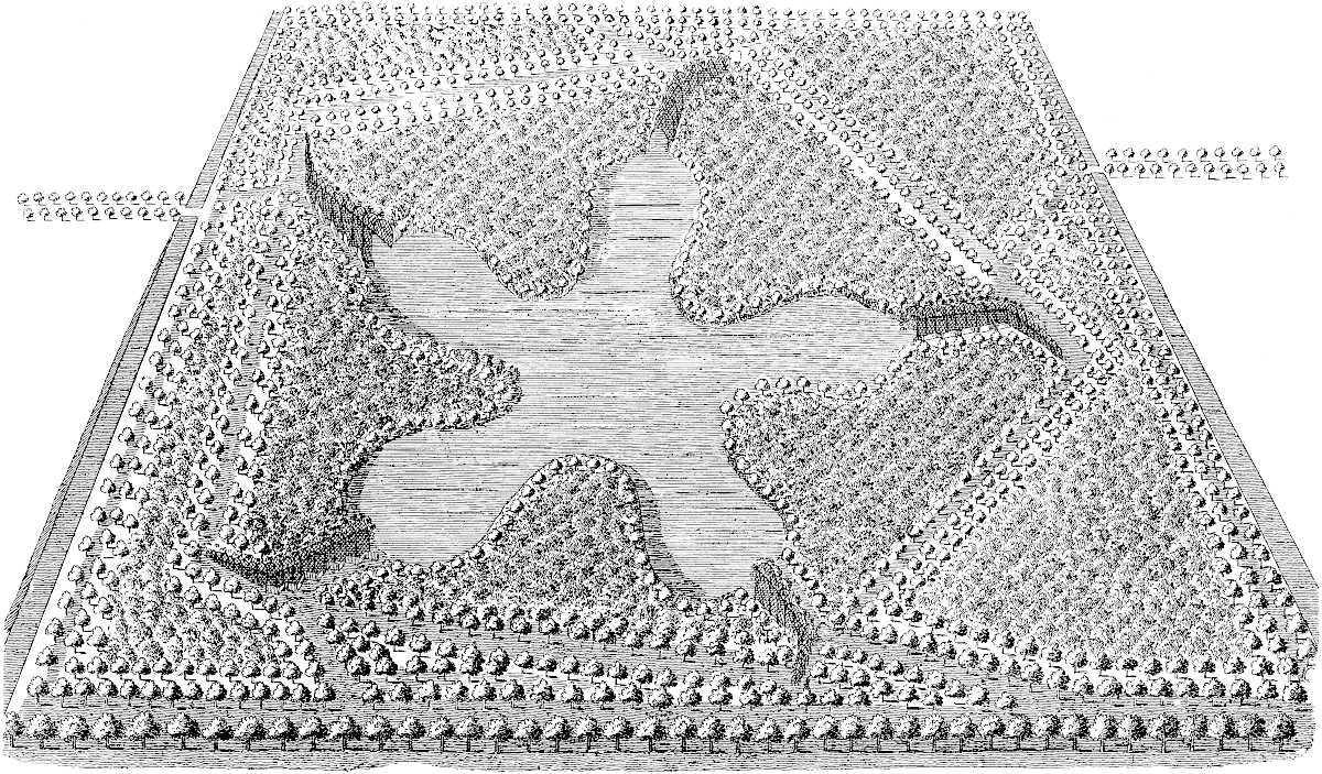 In the out-skirts of it are great numbers of decoys, places so called where they take an incredible quantity of wild ducks,[21] mostly sent up to London: they are large pits dug in the fens, with five canals shooting from them, each ending in a point after one angle made, well planted with willows, fallows, osiers, and such underwood. I have given a drawing of one. The method of catching fowl in short is this: the decoy-man coming down to the angle of the pipe, or canal, which is covered with nets and over-shadowed with trees, peeps through the holes in the reedy sheds, disposed like the scenes at the play-house, and joined by the others with holes at the bottom, about as high as a man’s breast: when he sees a sufficient quantity of wild ducks in the mouth of the great pond, by whistling softly, the tame ducks wing-stocked, and brought up for that purpose, swim into the pipe covered with the nets, to feed upon the corn he throws over the sheds into the water: this tempts the wild ducks in to partake of the bait: in the mean time a dog they teach runs round the half-sheds, in and out at the holes in the bottom, which amuses the fowl so that they apprehend no danger: when he has brought them far enough into the pipe, stooping he goes along the scenes, till he is got beyond the ducks, and rising up shows himself at the half-scenes, 19which frightens the wild ducks only, the opposite way into the narrow end of the pipe, which terminates in a fatal net: and all this is done without any noise or knowledge of the rest of the wild ducks in the great pond; so that the decoy-man having dispatched one pipe, goes round to execute the same game at all the rest, whereby infinite quantities are catched in a year’s time at one of these places only.