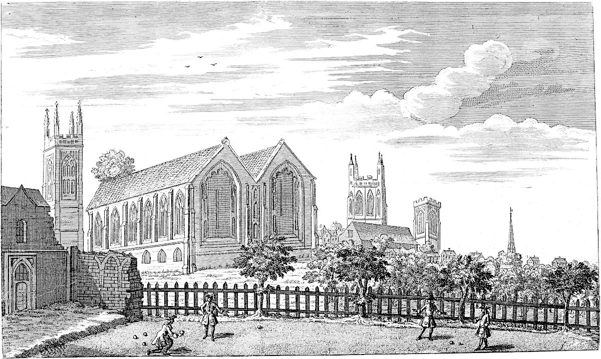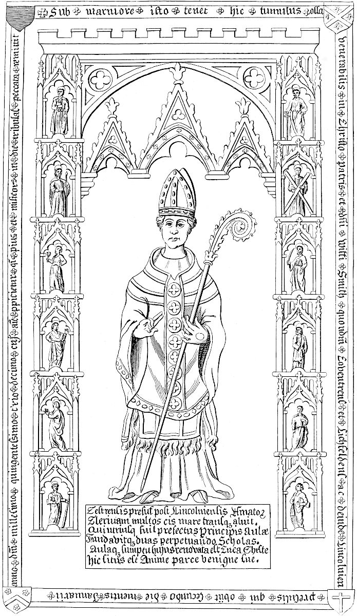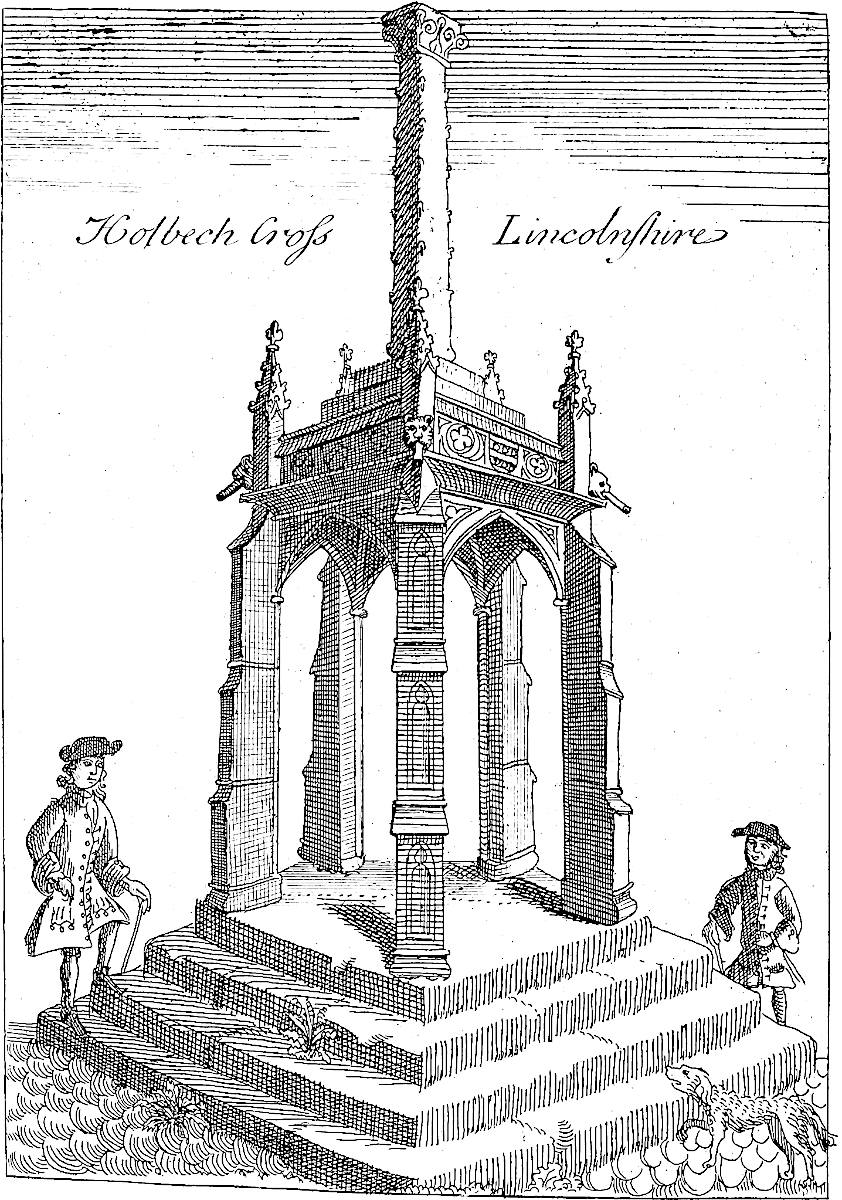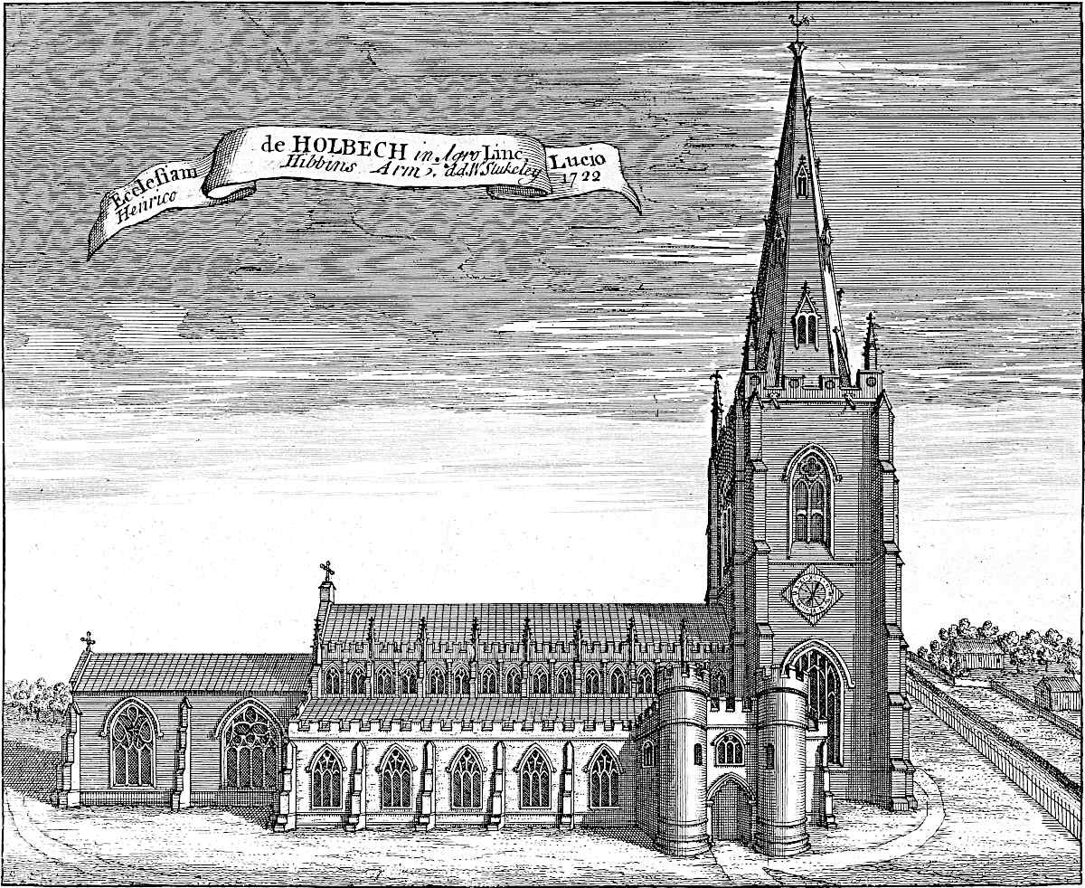 Holbech (the Salt-Beech) church is very large, and well built, a strong tower and lofty steeple, dedicate to all saints: formerly there were organs and fine painted glass, with many coats of arms, but none left except the Holbeches: Vert, six escallops argent, three, two, one.TAB. XXI. There is a fine monument of the Littleburys, an ancient and flourishing family in these parts:TAB. I. 2d Vol. upon his shield is his coat, Argent, two lions passant gardant gules: there is a brass inscription of a lady of the Welby family, wife to Sir Richard Leake, knight. Orate pro anima Johanne Welby quondam filiae Richardi Leake militis nuper uxoris Littlebury que obiit xviii die mensis decembris anno domini mccclxxxviii. cujus anime propitietur deus Amen. Here was born Henry Rands, alias de Holbech, bishop of Lincoln, who was one of the compilers of the Liturgy: here formerly flourished the ancient families of Fleet, Dacres, Harrington, Barrington, Welby, Multon.