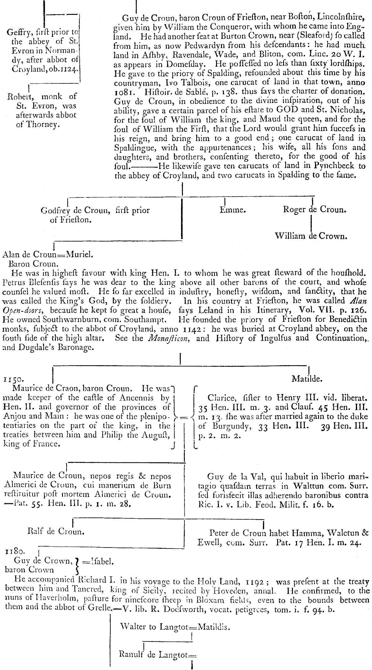 | Geffry, first prior to the abbey of St. Evron in Normandy, after abbot of Croyland, ob. 1124. | Guy de Croun, baron Croun of Frieston, near Boston, Lincolnshire, given him by William the Conqueror, with whom he came into England. He had another seat at Burton Crown, near (Sleaford) so called from him, as now Pedwardyn from his descendants: he had much land in Ashby, Ravendale, Wade, and Bliton, com. Linc. 20 W. I. as appears in Domesday. He possessed no less than sixty lordships. He gave to the priory of Spalding, refounded about this time by his countryman, Ivo Talbois, one carucat of land in that town, anno 1081. Histoir. de Sablé, p, 138. thus says the charter of donation. Guy de Croun, in obedience to the divine inspiration, out of his ability, gave a certain parcel of his estate to GOD and St. Nicholas, for the soul of William the king, and Maud the queen, and for the soul of William the First, that the Lord would grant him success in his reign, and bring him to a good end; one carucat of land in Spaldingue, with the appurtenances; his wife, all his sons and daughters, and brothers, consenting thereto, for the good of his soul.——He likewise gave ten carucats of land in Pynchbeck to the abbey of Croyland, and two carucats in Spalding to the same. | |
