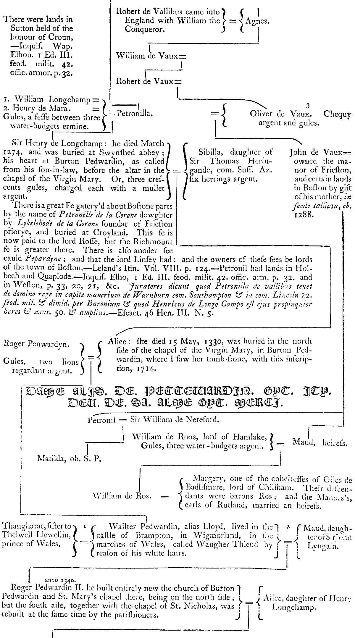 | anno 1340. Roger Pedwardin II. he built entirely new the church of Burton Pedwardin and St. Mary’s chapel there, being on the north side; but the south aile, together with the chapel of St. Nicholas, wasrebuilt at the same time by the parishioners. | Alice, daughter of Henry Longchamp. | |