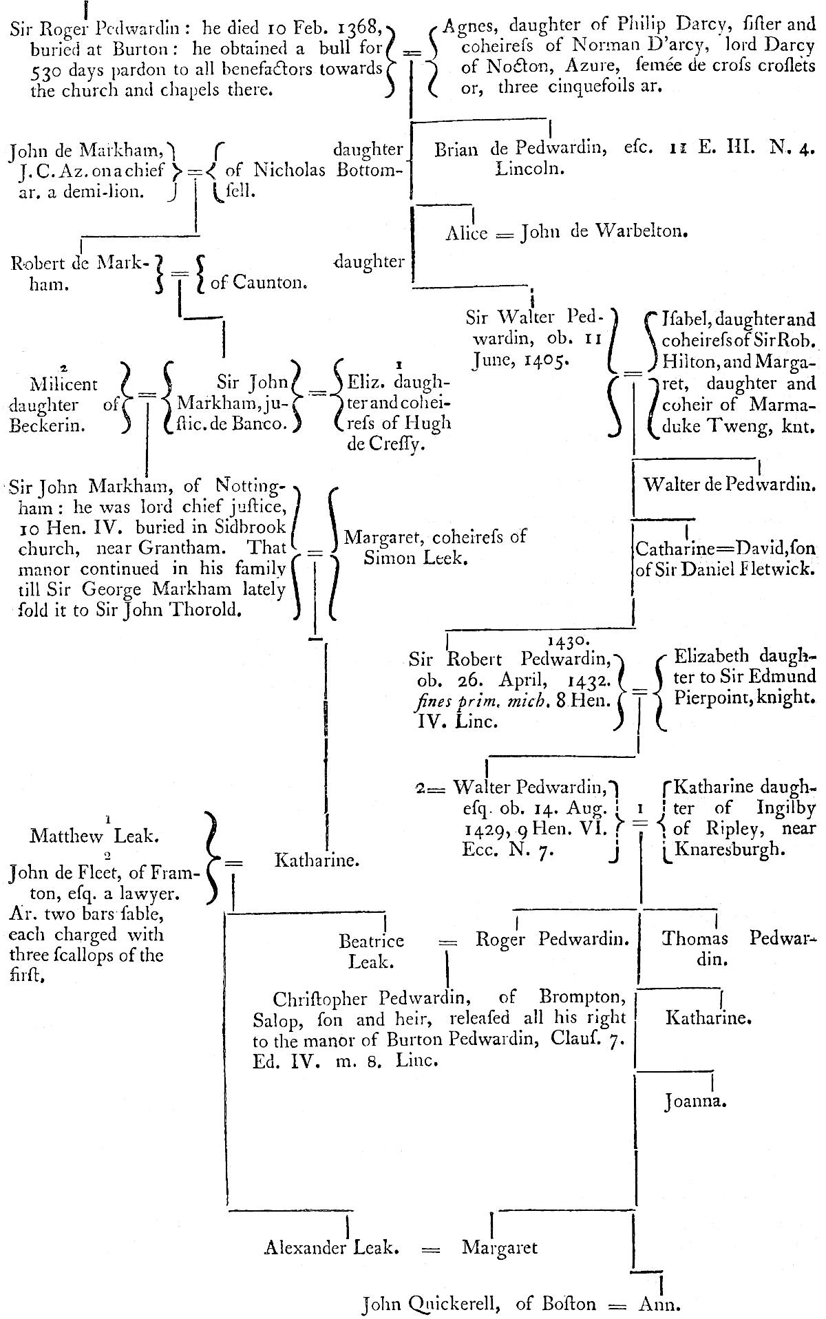 | 1430. Sir Robert Pedwarin, ob. 26. April, 1432. fines prim. mich. 8 Hen. IV. Linc. | Elizabeth, daughter to Sir Edmund Pierpoint, knight. | |