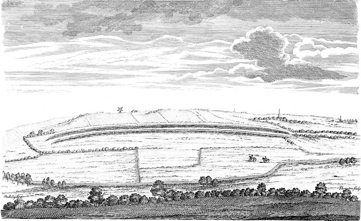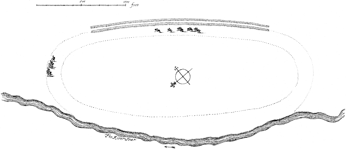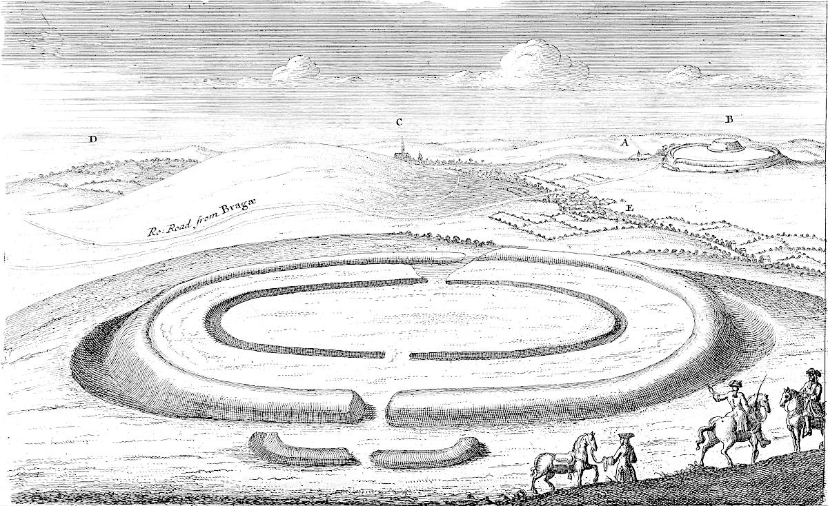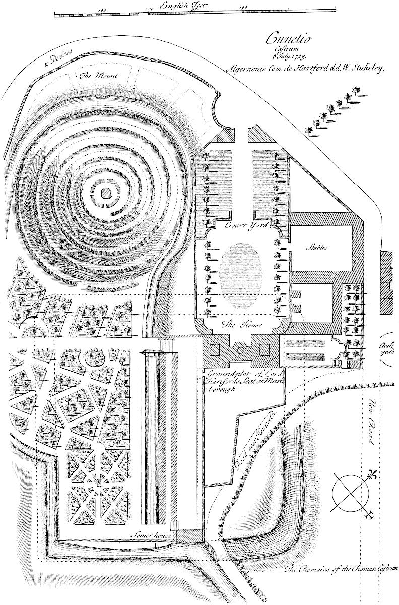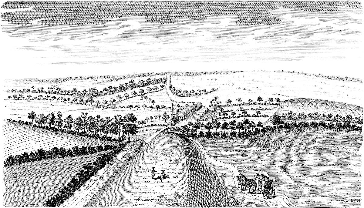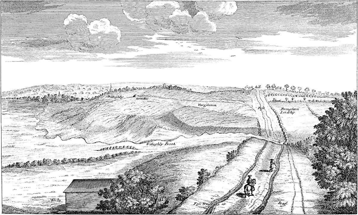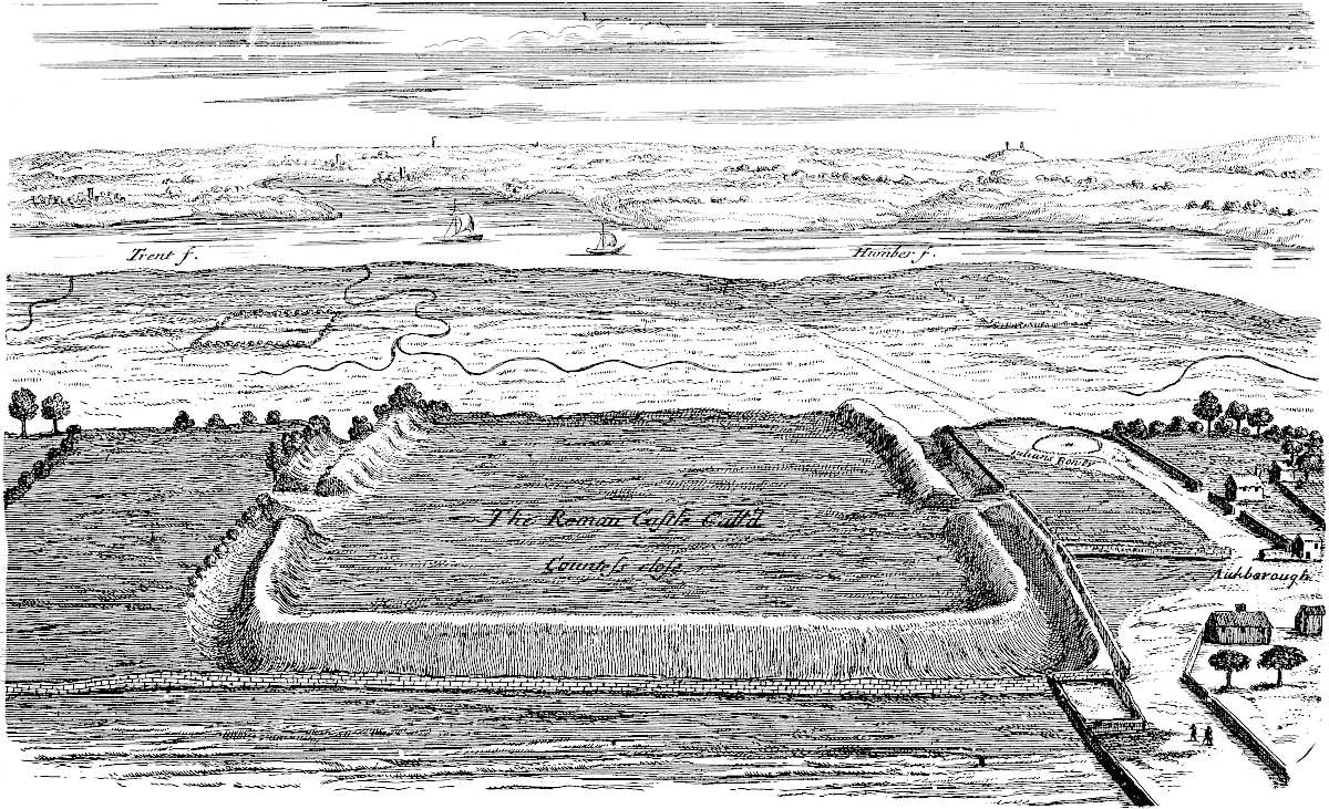 The 18th of October, 1728, I travelled on the Roman road, the eastern branch of the Hermen Street from Sleford, for about three miles southward. I observed that it went not to Sleford town directly, but to the old house of Sir Robert Carr’s, formerly Lord Hussey’s (attainted for treason in time of Henry VIII.) called Old Place. We saw by the way, on the east side the road, a mile or more south of Sleford, an old work, square, ditched about, large, with an entry from the road; the earth of the vallum thrown on both sides.