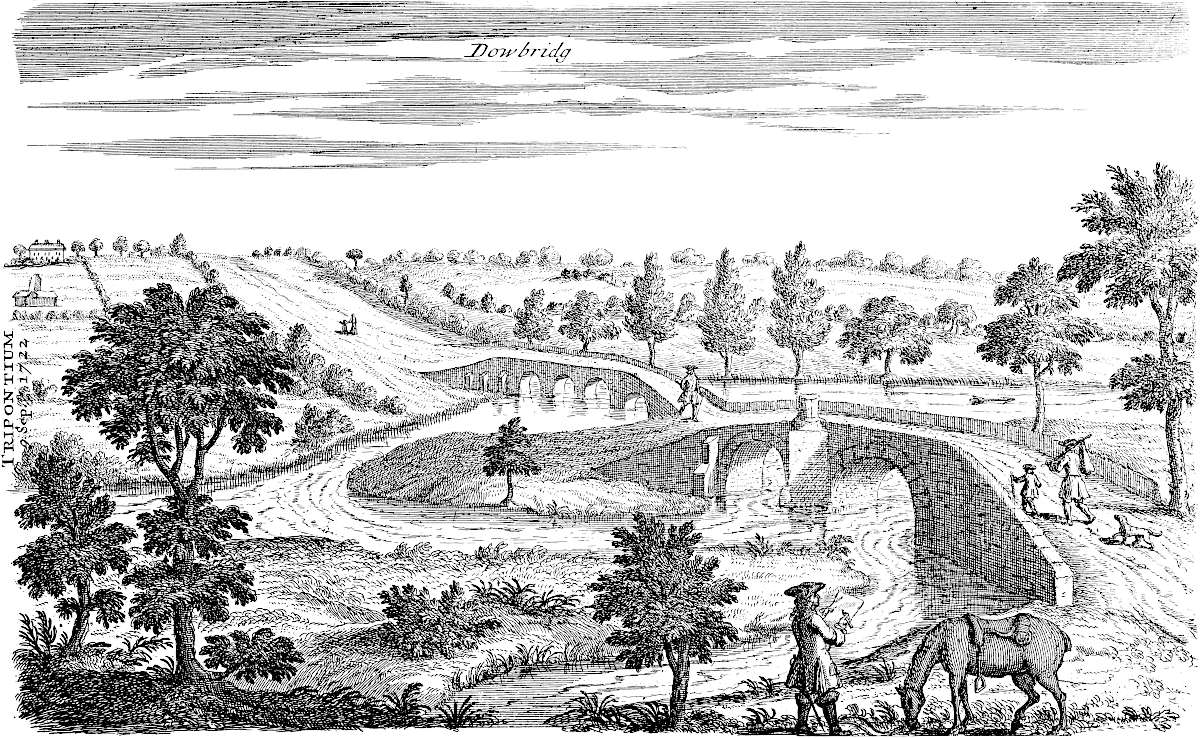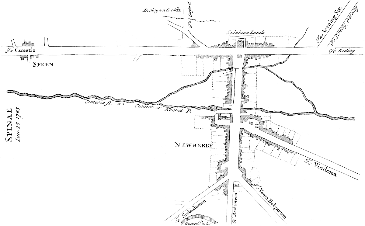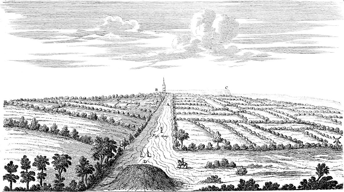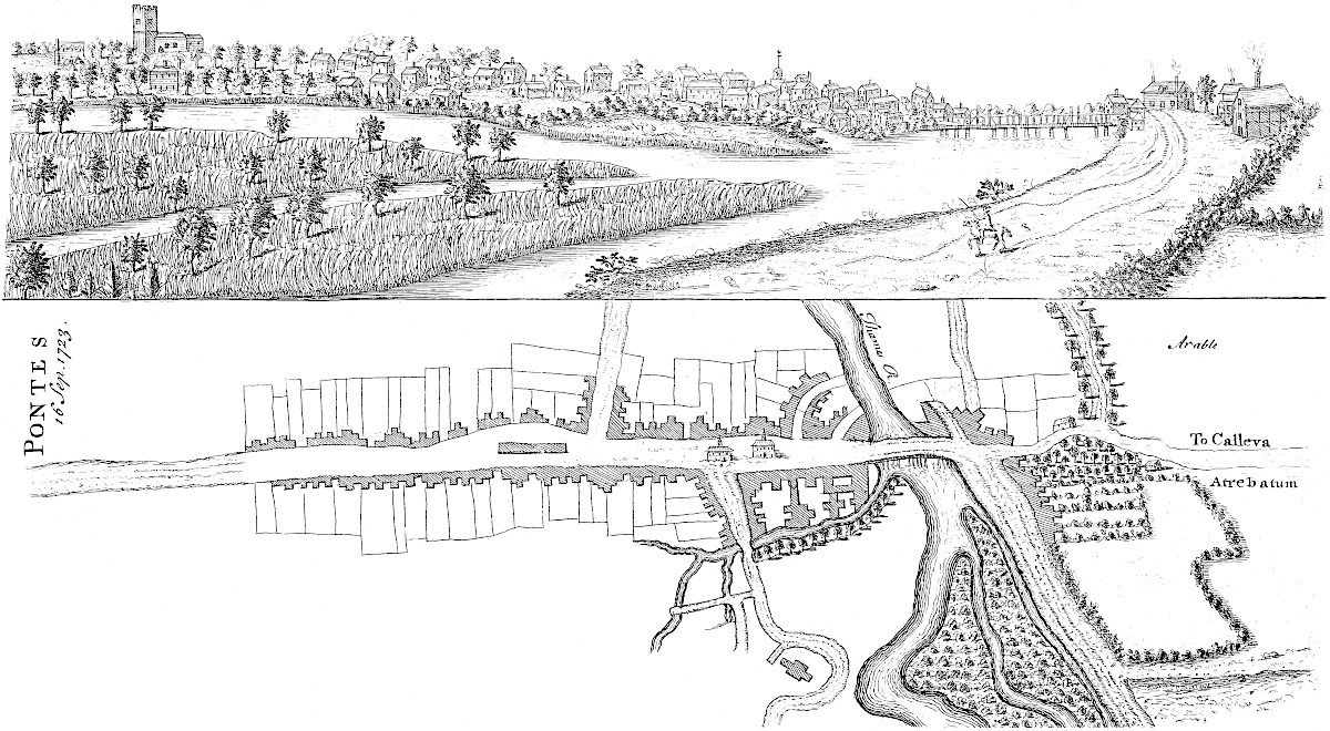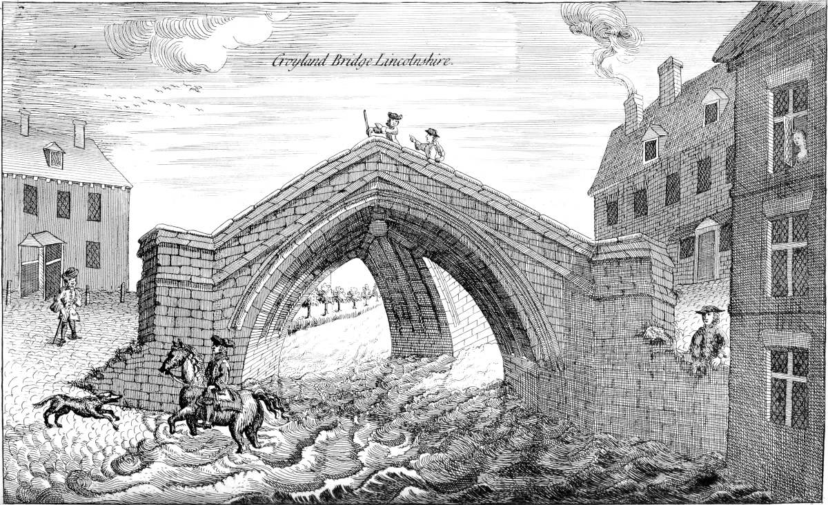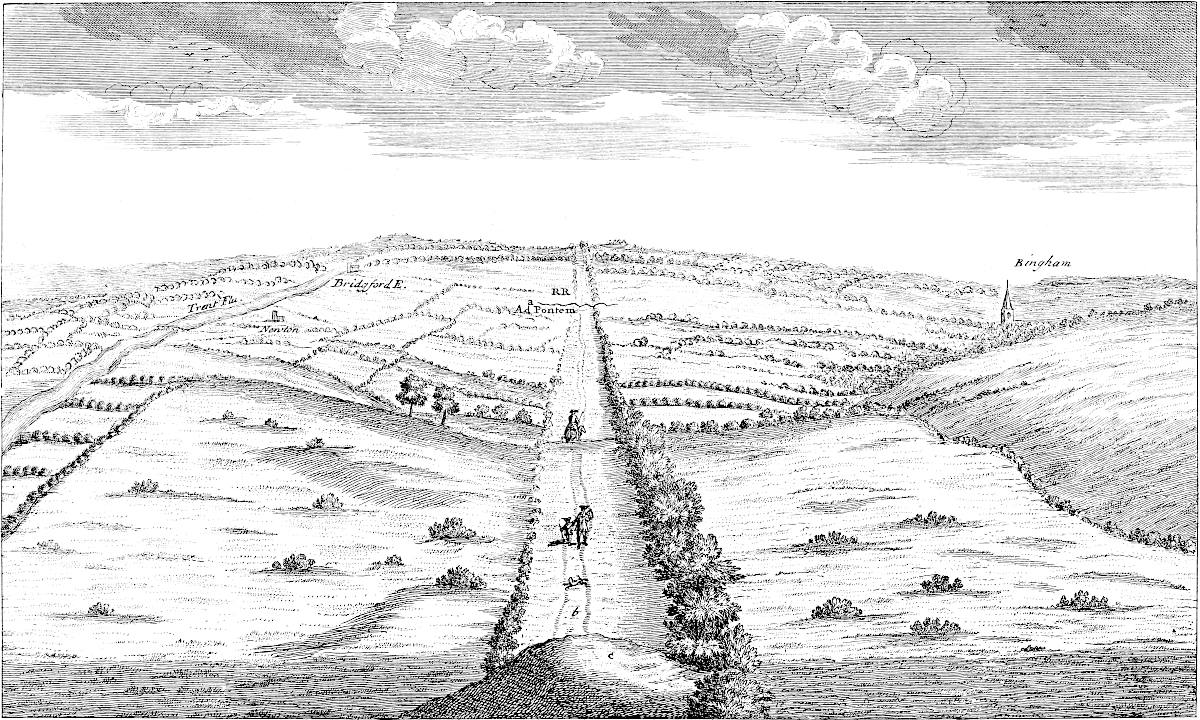 From Spalding, according to my sentiments, this road went towards Herring bridge (the word retaining some semblance of antiquity) upon Surflet river, so along the division between the wapentakes of Kirton and Aveland, near Wrigbolt and Cressy-hall, to the end of Brig-end causeway at Donington. Here, Holland brig or Brig-end causeway has all the requisites that can ascertain it to be a Roman work, being strait and laid with a solid bed of stone: the present indeed is repaired every year, but we have much reason to think the first projection of it through this broad morass was no less than Roman. From thence it went to Sleford; then it seems to have gone across the heath, and to have fallen in with the great Hermen street at a remarkable place called Biard’s leap: from thence possibly it was carried, or was designed to be, by Stretleythorp and Brentbroughton over the Witham to Crocolana upon the foss-way; then over the Trent into Nottinghamshire, where it answers in a line with the road to Tuxford and Worksop; and so on perhaps to the Irish sea, whereby it would become a great parallel to the Watling street running across the kingdom, as it does, from south-east to north-west. At Sleaford I am inclinable to think another road came from Banovallum, or Horn castle, to the east of the river Bane southward by les Yates, and so crossed the Witham by Chapelhill and the Cardike somewhere about Kyme: or else crossed the Witham at the Hermitage, so went by Swinshed north end to Donington: this principal road we speak of on the other end seems to go from Ely by Soham and Bury to the German ocean. I am not ashamed to offer my conjecture to the curious, however slender its foundation may be, if only as a hint for a future search: but it seems to me very probable, that if it was not fully executed by the Romans, they intended it, and have in part manifestly done it. I conceit it crosses the Icening street at Ikesworth near Bury, then goes to Bretenham, the Combretonium; but with that country of Suffolk I am at present perfectly unacquainted. Return we to Holland.