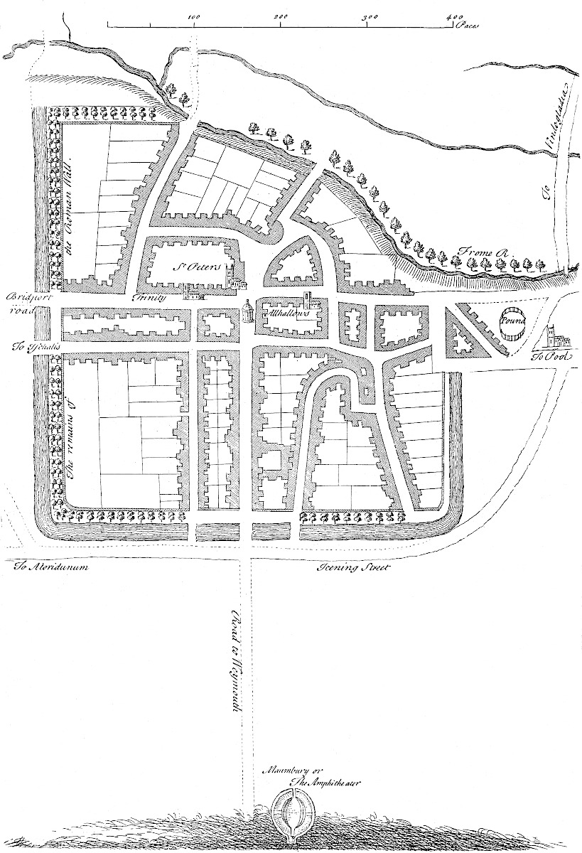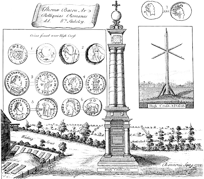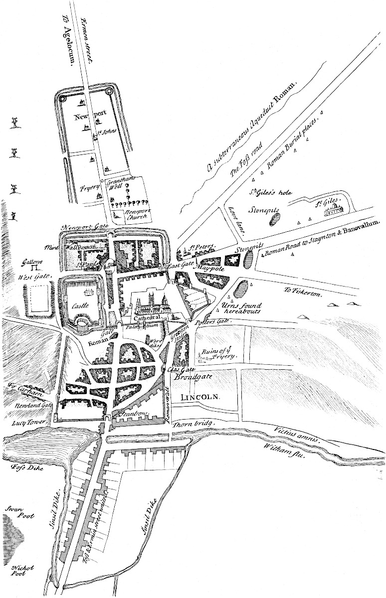 But it was not enough for the Romans thus to provide for commerce and travelling, without they set proper stations or mansions for the reception of negociators and the like. Accordingly we find the distance between Caster and Lincoln, about 40 miles, has two towns upon it at proper intervals for lodging; these are Sleaford and Stanfield: the original names of them are in irrecoverable silence, but the eternity of the Romans is inherent. Sleaford Ro. town.At Sleaford they have found many Roman coins, especially of the Constantine family and their wives, about the castle and the spring-head a little above the town. It is probable that Alexander, the bishop of Lincoln, built his work upon the site of a Roman citadel. Beside, at Sleaford comes in the other Roman road from the fen country by Brig-end causeway, and at the intersection of these two roads the old town stood. At Stanfield,Stanfield Ro. town. which is a little village near Burn, they find daily the foundations of buildings, innumerable coins and other antiquities, of which yourself and our friend Mr. John Hardy have a good quantity. These are chiefly dug up in a close called Blackfield, from the extraordinary richness of the ground. It stands half a mile off the road upon elevated ground, whence you may see Spalding, Boston, and the whole level: it is now only of some note for a good chalybeat spring.