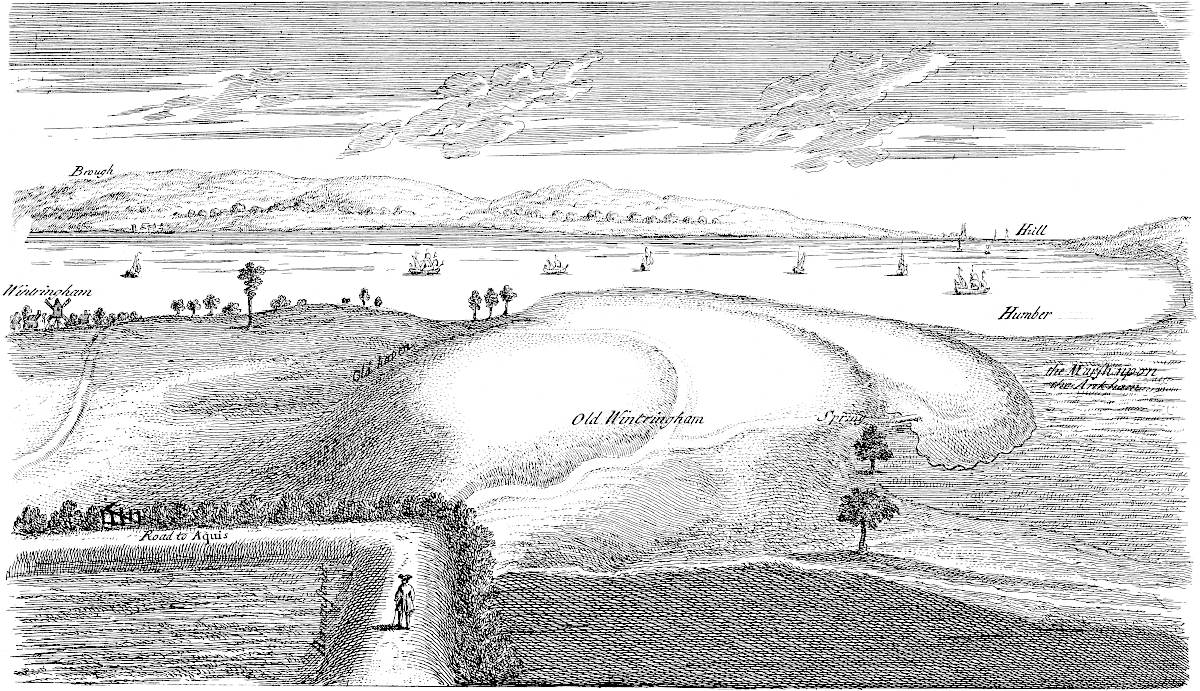 The truth of this observation I have seen universally confirmed in all my travels, and innumerable instances of it will occur to the reader throughout these discourses. I design another time professedly to treat of it in a philosophical way. But consequent to this doctrine it is that we have so large a quantity of this marshland in the middle of the eastern shore of England, seeming as if made by the washings and eluvies of the many rivers that fall that way, such as the Welland, the Witham, the Nen, the Ouse great and little, together with many other streams of inferior note. These all empty themselves into the great bay formed between the Lincolnshire wolds and cliffs of Norfolk, called by Ptolemy Mentaris æstuarium, as rightly5 corrected by Mr. Baxter, seeing it is composed of the mouths of so many rivers; Ment, or Mant, signifying ostium in the British language. Beside the great quantity of high and inland country that discharges its waters this way, even as far as Fritwell in Oxfordshire; all the level country lies before it, extending itself from within some few miles of Cambridge south, to Keal hills near Bolingbroke in Lincolnshire north, about sixty miles long, known by the names of the Isle of Ely, Holland and Marshland. This country, since the flood, I believe was much in the same state as at present, and for its bulk the richest spot of ground in the kingdom; once well inhabited by gentry, especially the religious. I apprehend the more inland part of it, the Isle of Ely, Deeping Fen, &c. was not in distant ages in so bad a condition as now, because the natural drainage of it was better, before the sea had by degrees added so much solid ground upon the coasts.