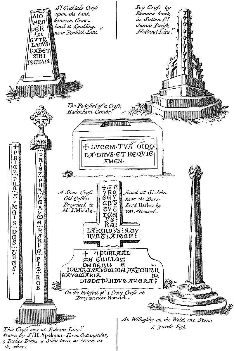 Not long since some British instruments of brass called celts, arrow-heads, and bits of bridles of the same metal, were found at Aye near the Cardike. The 19th of November, 1731, I saw four celts and a brass spear-head found at Ege, or Aye: the celts were of the female or recipient kind: they were bought by bishop Kennet, and are now in the gentlemen’s society at Peterborough. The Druids buried them there, when the Romans drove them northward: there has been some great work of the Druids there, as I take it. At Jernham was found an old brass seal, a man blowing a horn, the legend John de Sodeburi, now in the hands of Mr. Richards of Stanford. At Edenham was a stone cross now demolished: the inscription on it I have inserted in the TAB. XI.Plate of Crosses: I saw the stump of it remaining not long since: hard by has been an old castle at Bitham. Grimsthorp, the pleasant seat of the Duke of Ancaster: the park is very large and beautiful; in the middle of it stood Vaudy abbey in a vale, founded by Wil. de Albemarle 1147. some small ruins of it are left: the lawn there, whereon is an annual horse-race, is extremely delightful.[13] In Hakunby church upon a stone I read this inscription,
