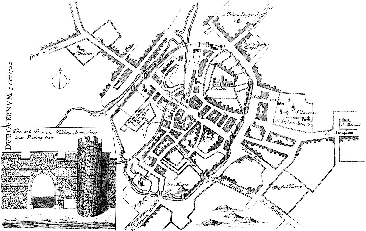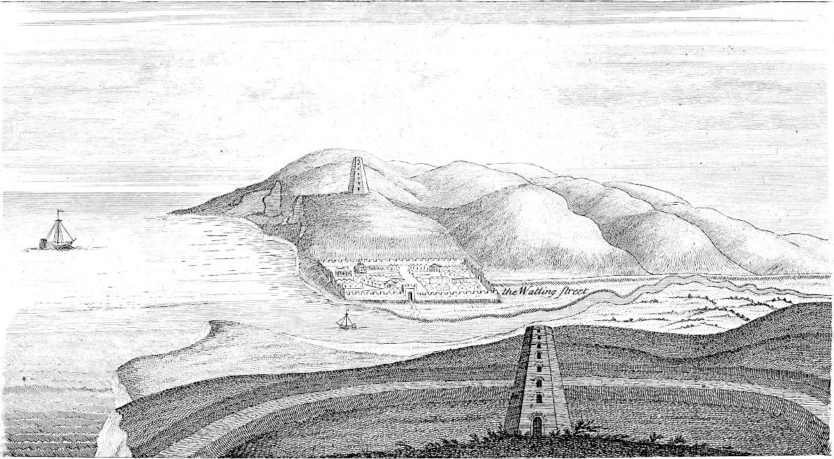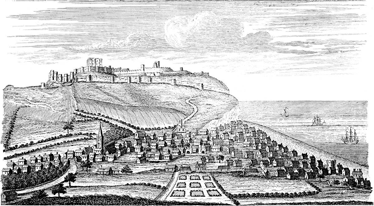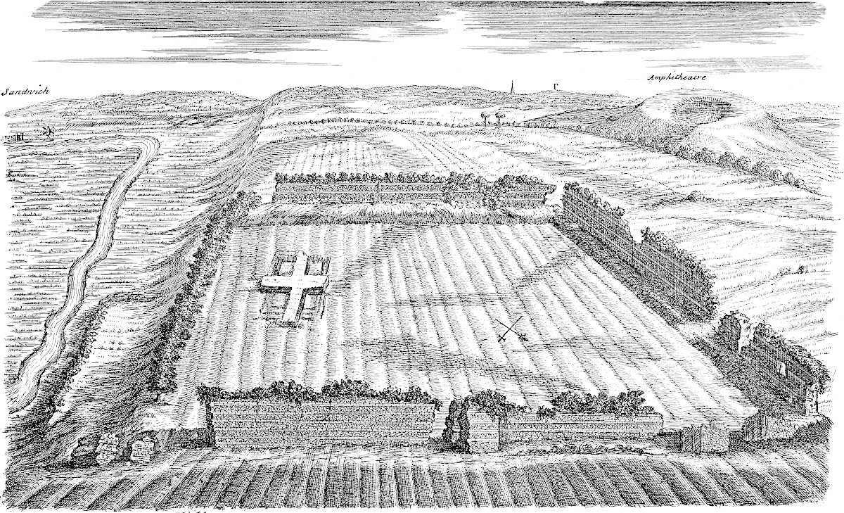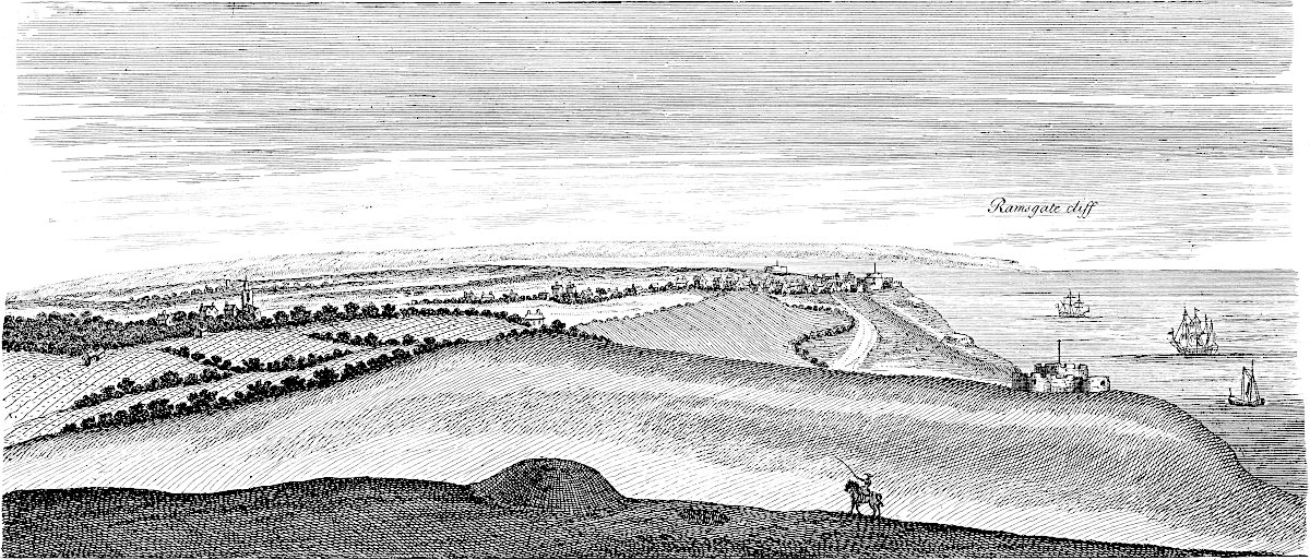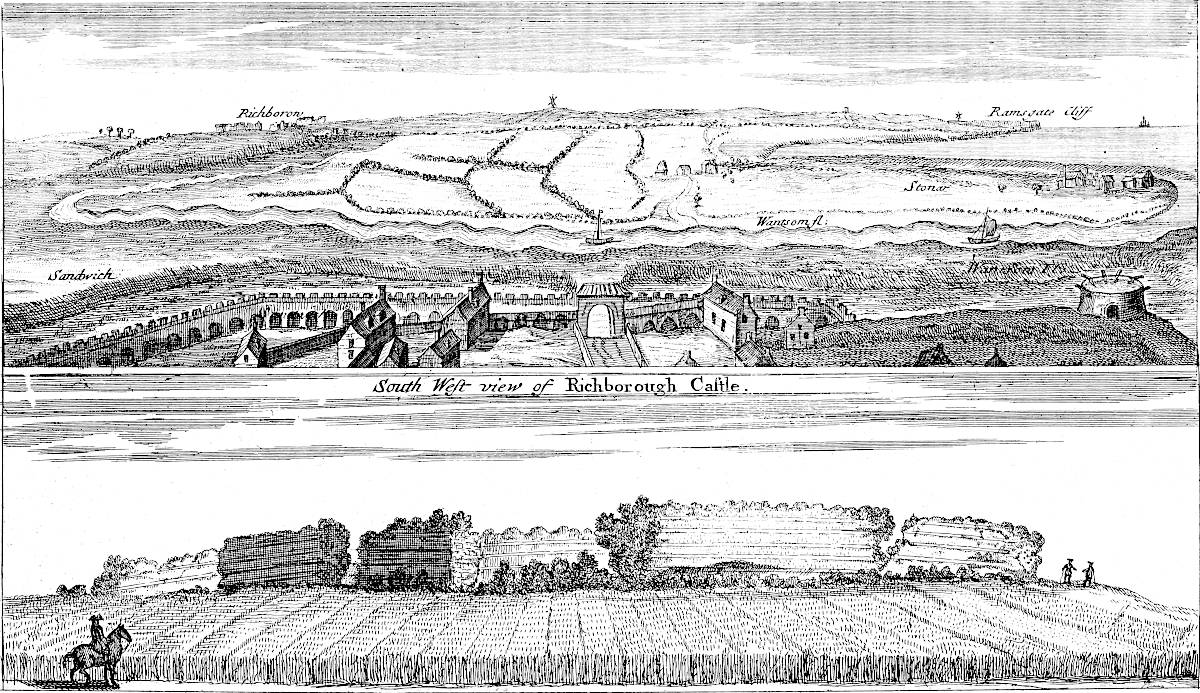 Sandwich is in a miserable, decayed condition, following apace the downfall of its mother Rutupium: it might easily be made the best harbour on this coast, by cutting a new channel for the river about a mile and half through the sand-hills south easterly; for the water of the river Stour would sufficiently scour it, did it run strait, and with that direction. All the walls and bulworks of the town are dismantled, the gates tumbling down; and a few cannon lie scattered here and there. This town likewise might be made very strong; for, besides the river Stour, another rivulet runs through it, that would keep the ditches always full.