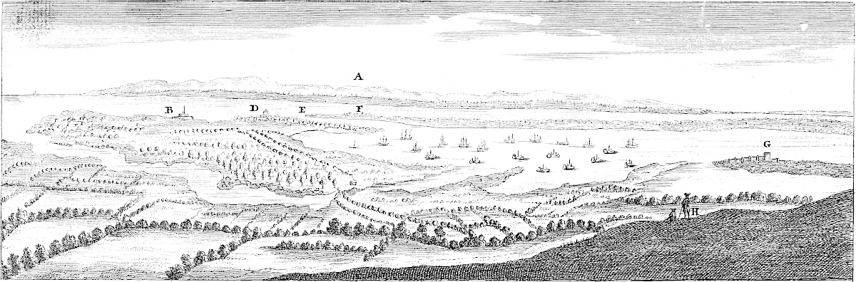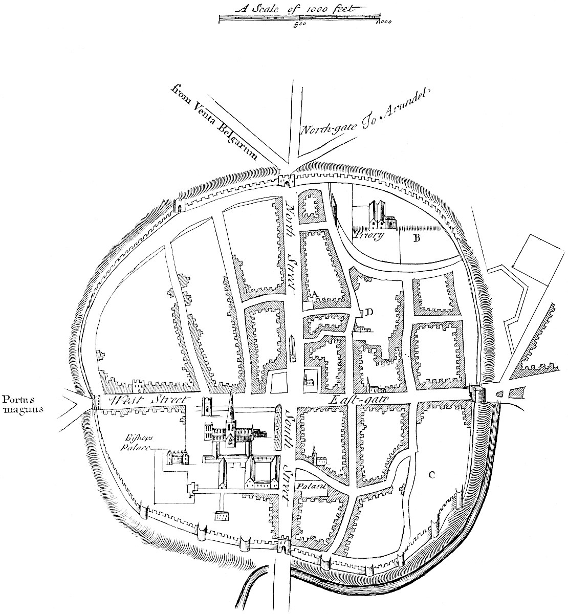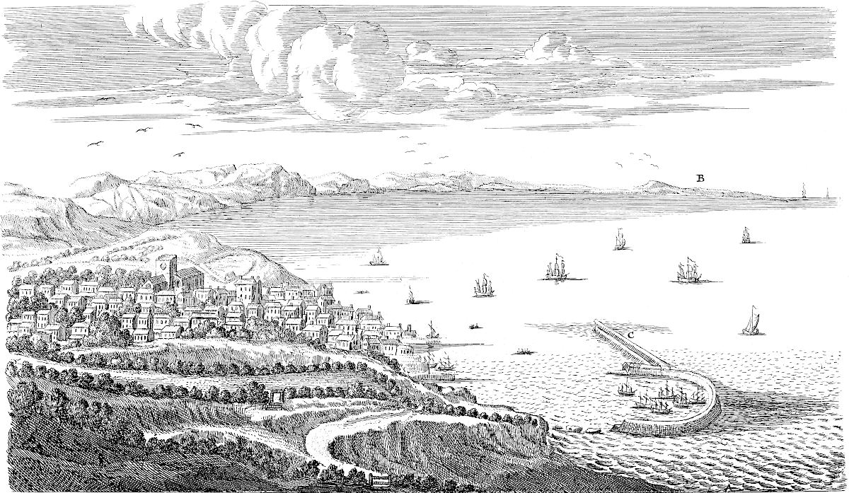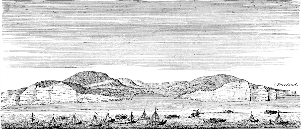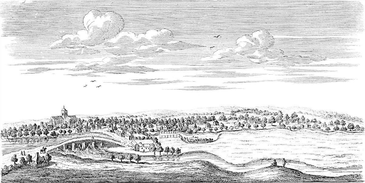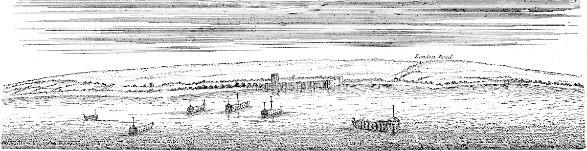 Sandwich is in a miserable, decayed condition, following apace the downfall of its mother Rutupium: it might easily be made the best harbour on this coast, by cutting a new channel for the river about a mile and half through the sand-hills south easterly; for the water of the river Stour would sufficiently scour it, did it run strait, and with that direction. All the walls and bulworks of the town are dismantled, the gates tumbling down; and a few cannon lie scattered here and there. This town likewise might be made very strong; for, besides the river Stour, another rivulet runs through it, that would keep the ditches always full.