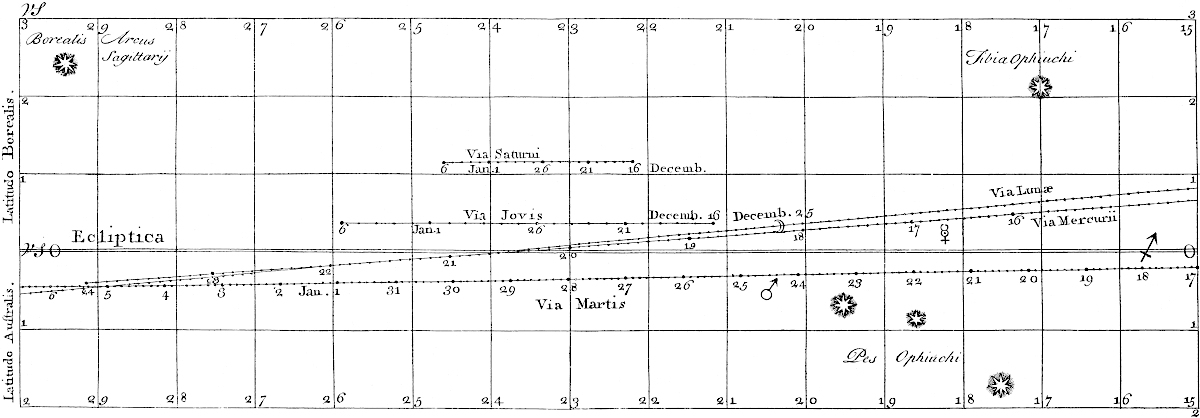 The last plate, of the great conjunction of the five planets, I added as an æra of my book. This memorable appearance, because it affected not the vulgar like a solar eclipse, was almost neglected by the learned. I had a mind to do it justice by printing the type of it from the diagram sent me by the great Dr. Halley. For my part, I congratulate myself for living in an age fruitful of these grand phænomena of the celestial bodies, and am pleased, that beside the total eclipse 1715, we have in the space of two years this great conjunction, a transit of Mercury across the sun, a comet, the last eclipse of the sun, and in March next another great conjunction.