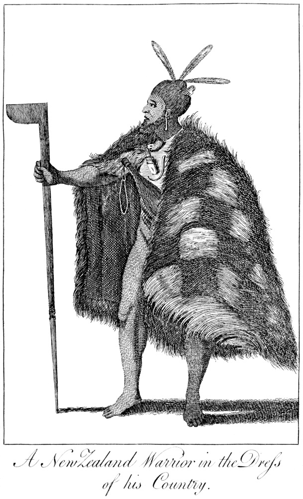 In the morning the second Lieutenant was sent to bring the Master back, soon after which four Indians, in a small canoe, were within sight. The Captain now determined to take no notice of these people, as the most likely way to be noticed by them. This project answered: two of them came within musket-shot of the vessel, where they conversed very loud: in return the people on board shouted, and made signs of invitation. The Indians gradually approached, with their lances held up, not in a menacing manner, but as if they meant to intimate they were capable of defending themselves. They came almost along-side, when the Captain threw them cloth, nails, paper, &c. which did not seem to attract their notice. At length one of the sailors threw them a small fish, which so pleased them, that they hinted their design of bringing their companions, and immediately rowed for the shore. In the interim, Tupia 443and some of the crew landed on the opposite shore. The four Indians now came quite along-side the ship; and having received farther presents, landed where Tupia and the sailors had gone. They had each two lances, and a stick with which they throw them. Advancing towards the English, Tupia persuaded them to lay down their arms, and sit by him, which they readily did. Others of the crew now going a-shore, the Indians seemed jealous, least they should get between them and their arms; but care was taken to convince them that no such thing was intended, and more trifles were presented to them. The crew staid with them till dinner-time, and then made signs of invitation for them to go to the ship and eat; but this they declined, and retired in their canoe.